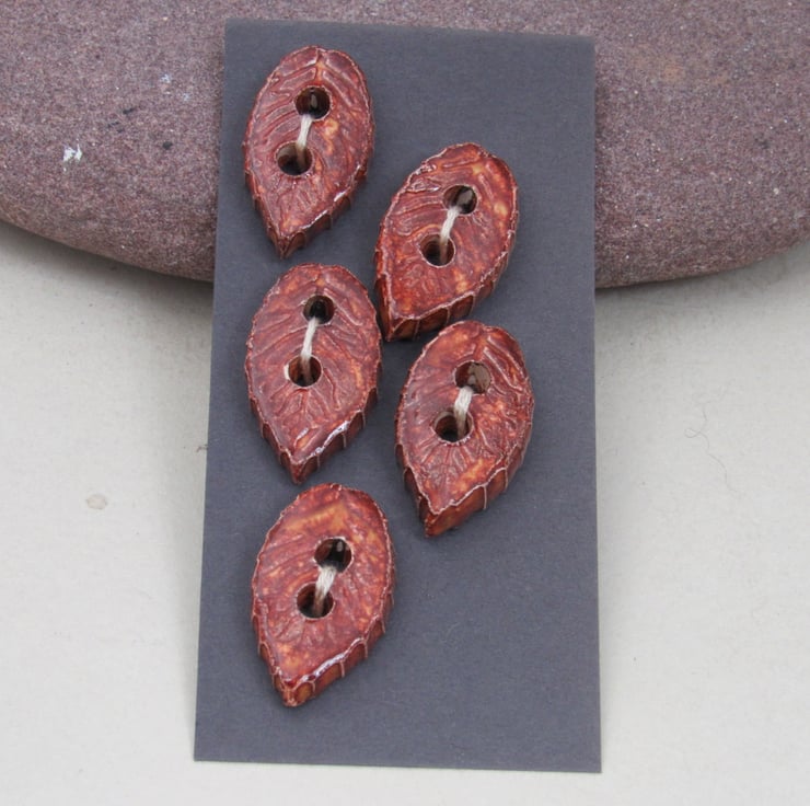 5 small stoneware buttons cut to a toothed leaf shape and finished with a bright copper brown glaze