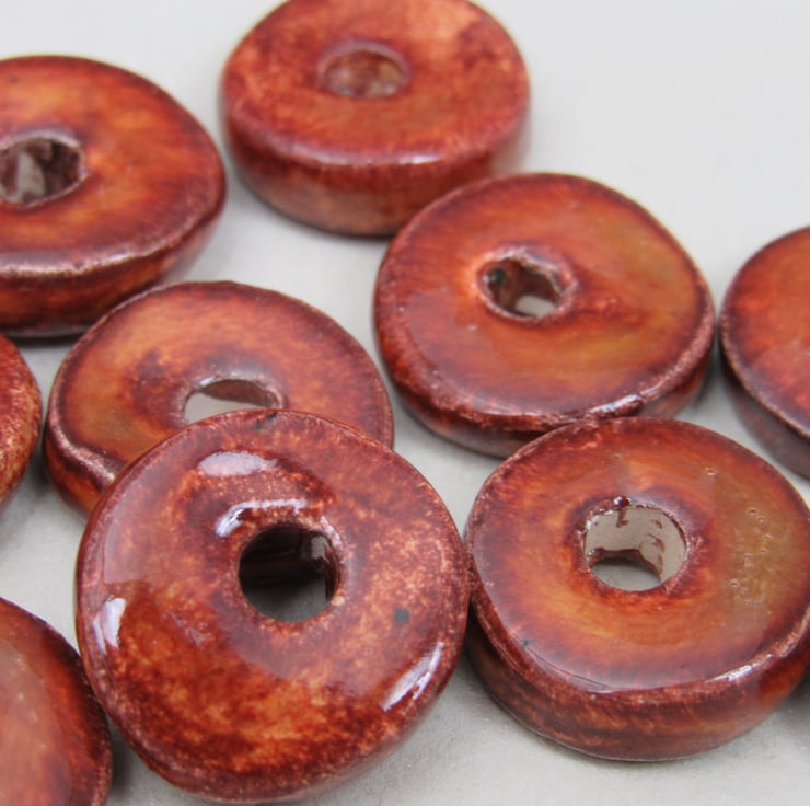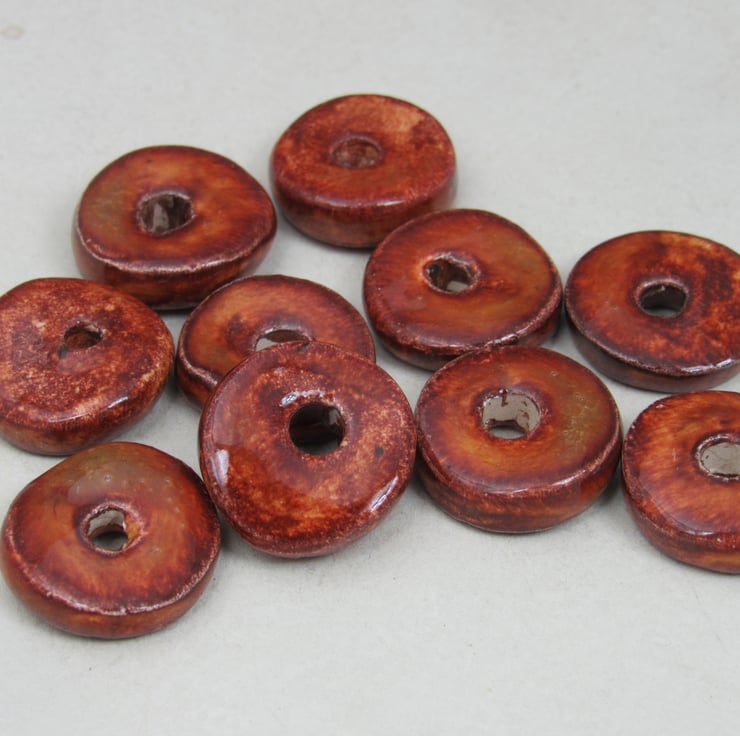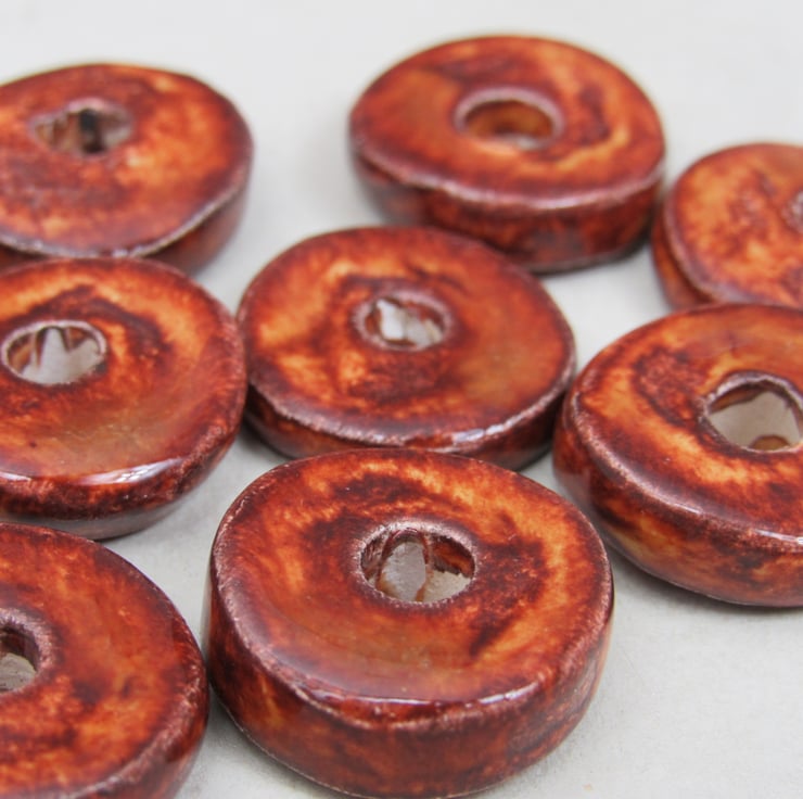 They are approx 1.8 cms (0.7") diameter, with a 3mm (0.1") hole but as they are handmade, they are not identical and not perfectly round.