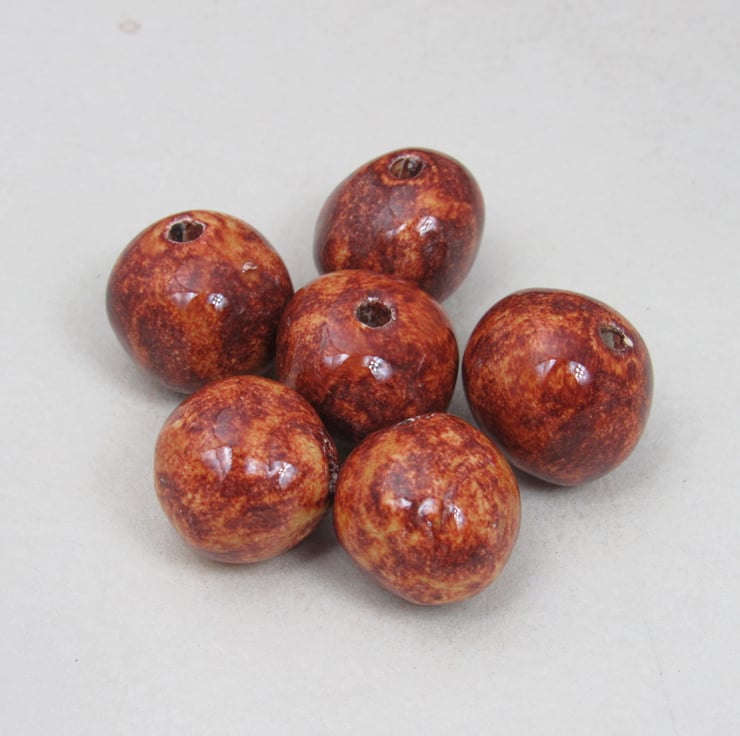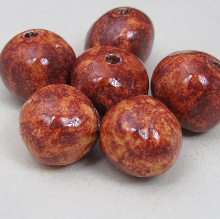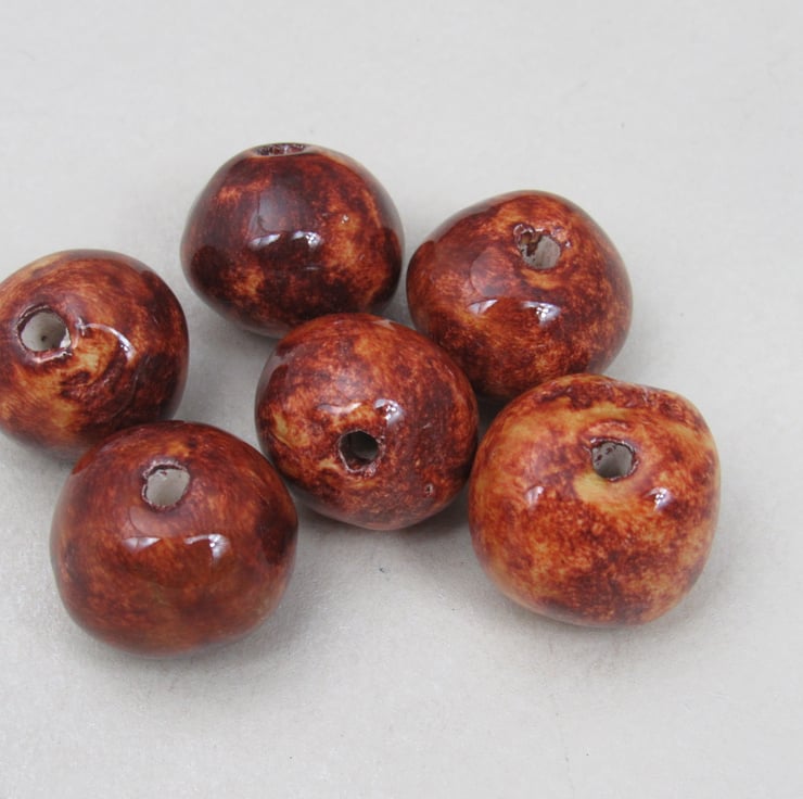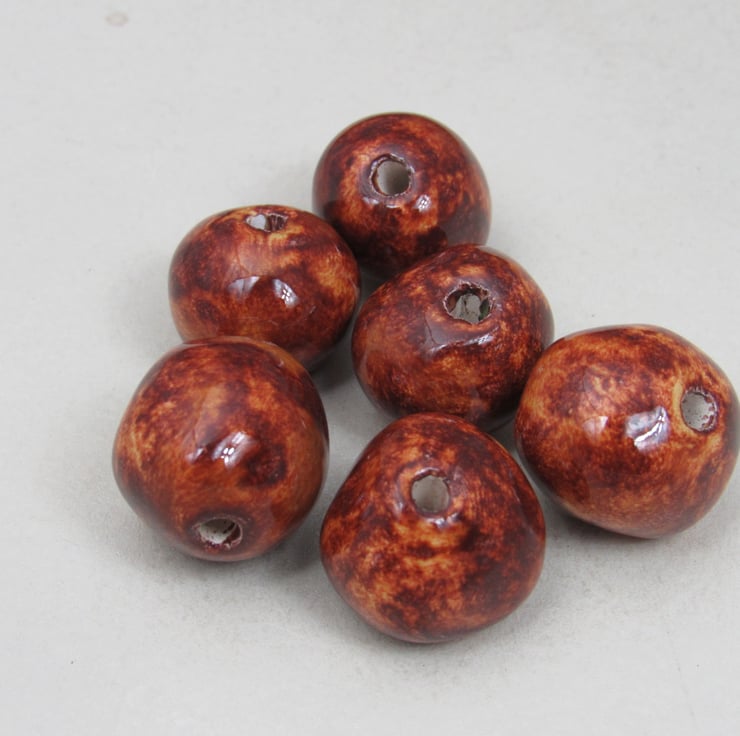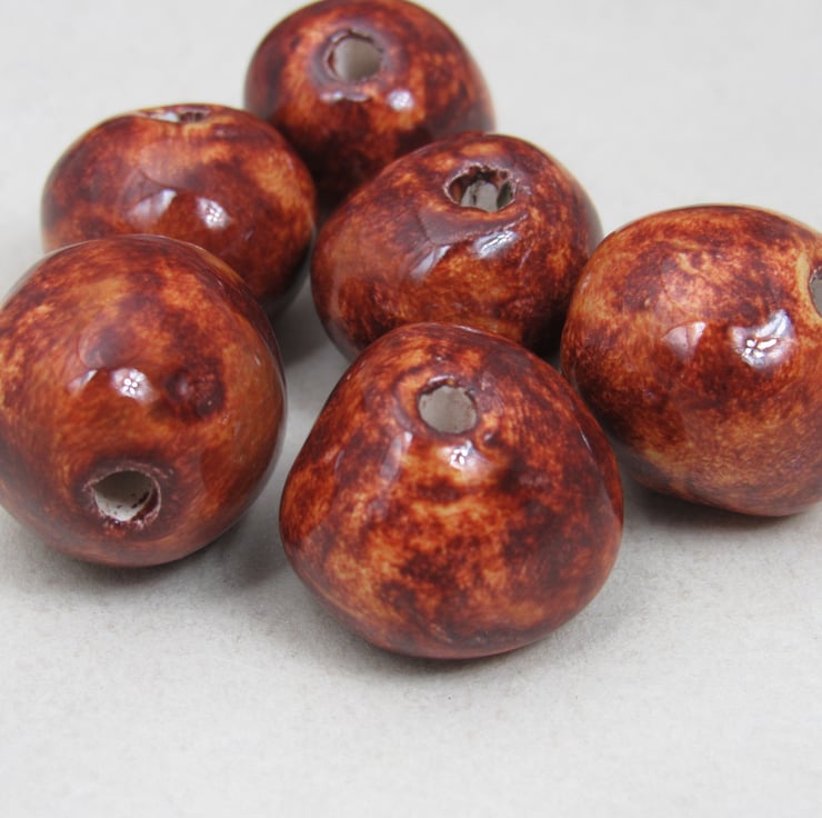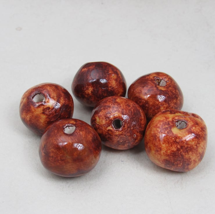 A mixture of handrolled ceramic beads, finished with a bright copper brown glaze.