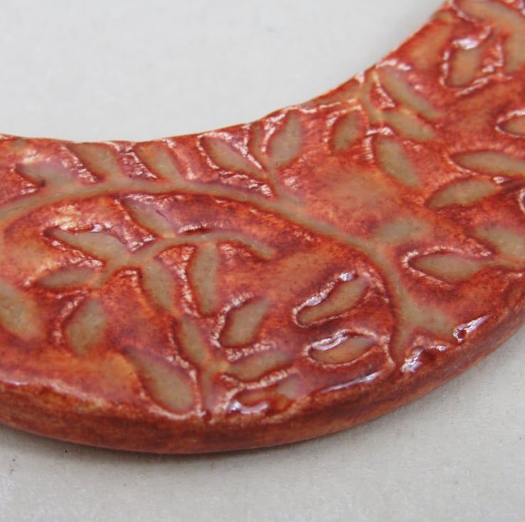 Stoneware ceramic bib pendant patterned with a delicate leaf motif pattern.