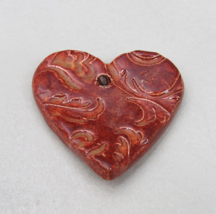 Medium heart shaped stoneware pendant, textured with a bold leaf and flower motif.