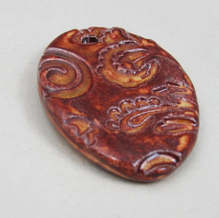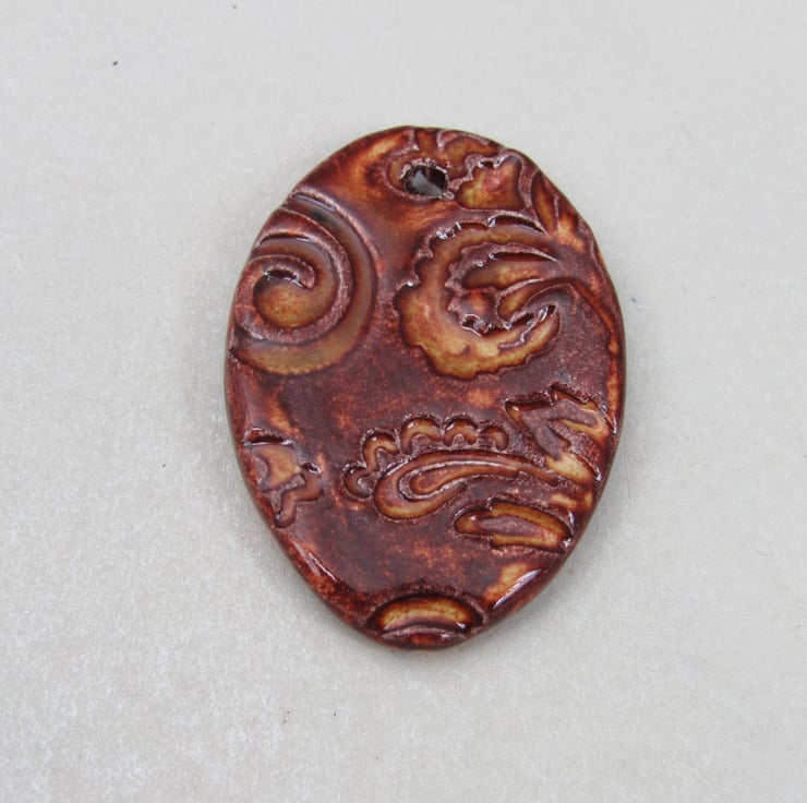 Large stoneware ceramic pendant, patterned with an embossed design of leaves and flowers, and finished with a bright copper brown glaze.