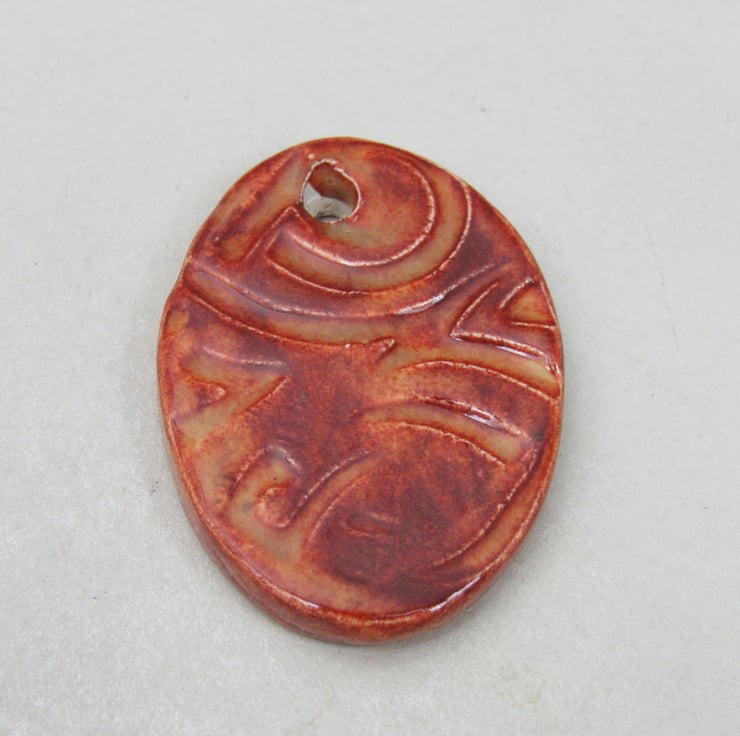 Large stoneware ceramic pendant, patterned with an embossed design of celtic knotwork, and finished with a bright copper brown glaze.