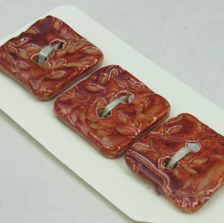 3 medium sized earthenware buttons, textured with delicate leaf print and finished with a glossy bright copper brown glaze with pale highlights