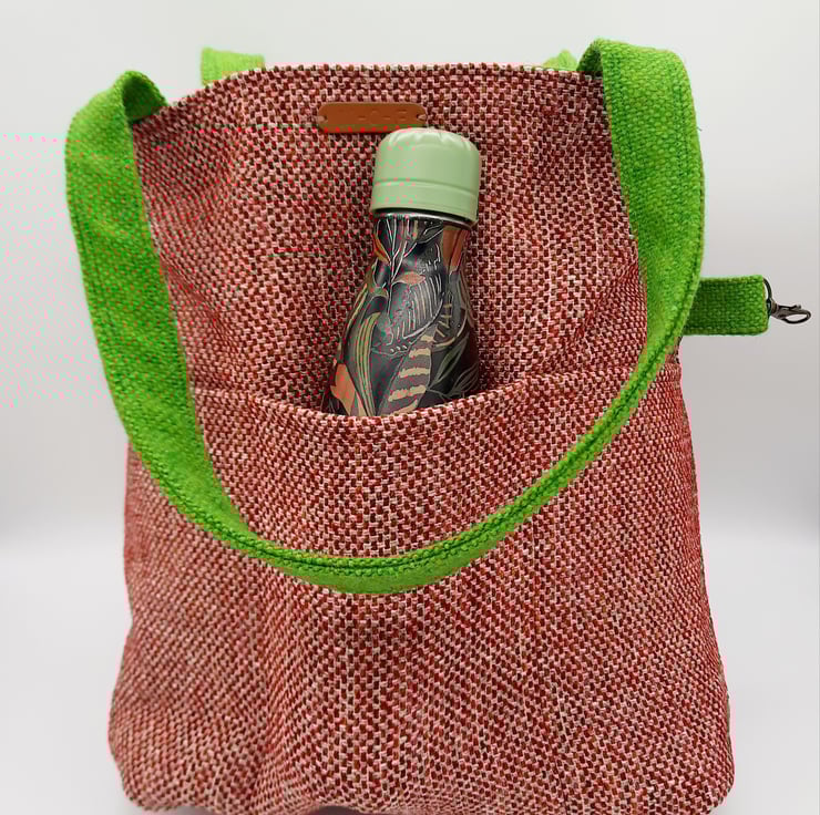 It has 3 deep slip in pockets which are large enough to hold a water bottle. There's also a antique gold swivel claw hook to attach your keys to.