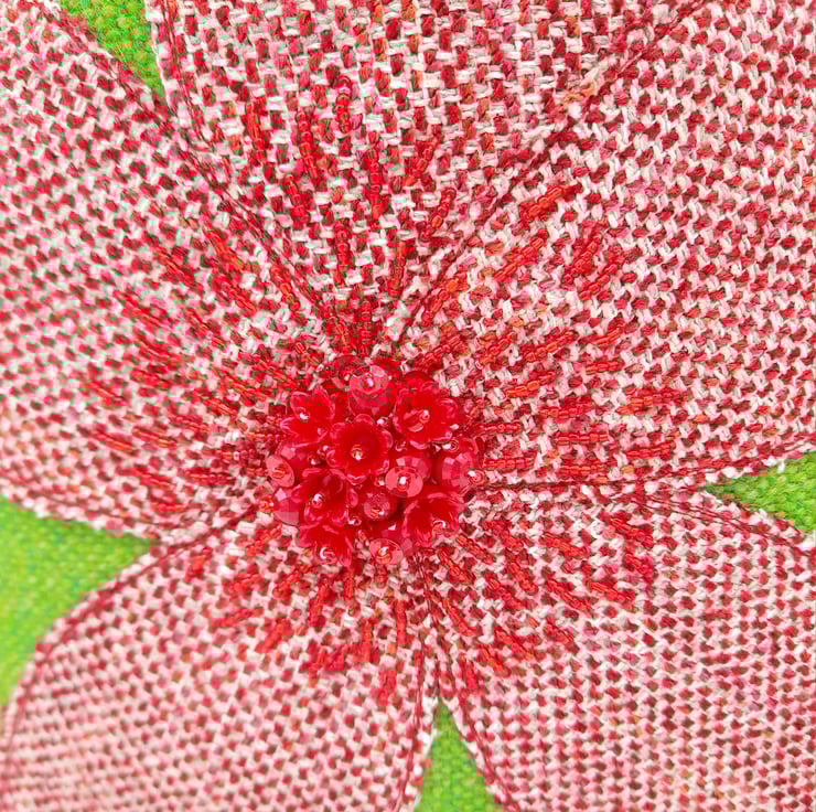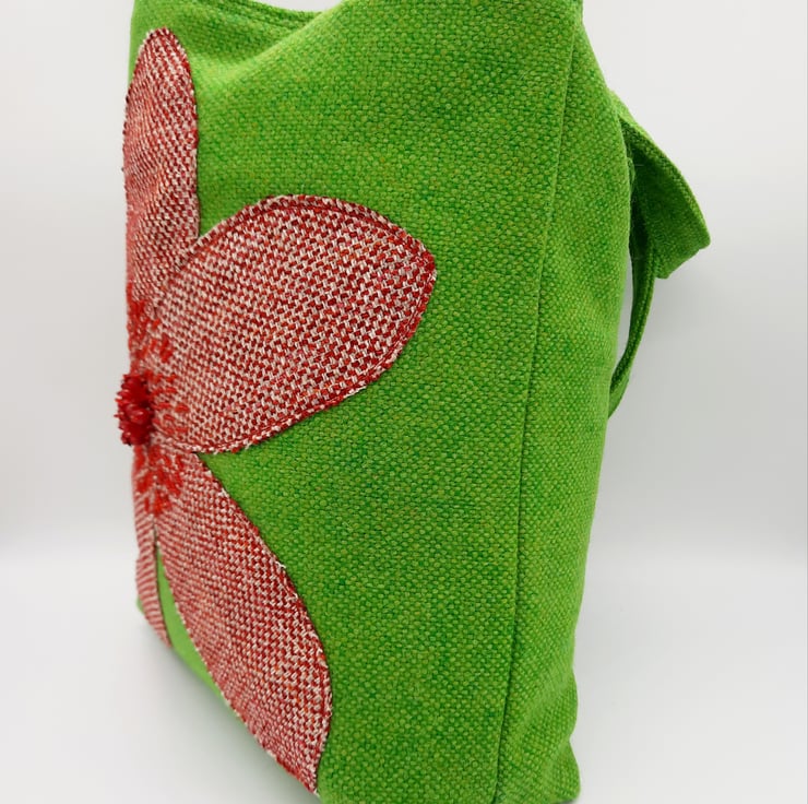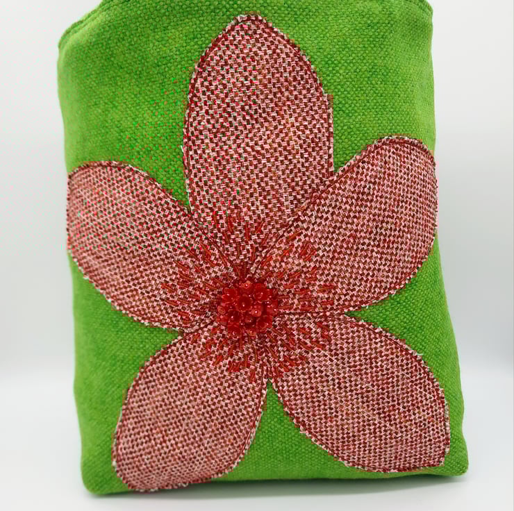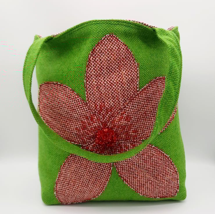 Gorgeous green tweed handbag with a red applique flower detail. The centre of the flower has been hand beaded with seed beads, sequins, large red glass beads, flower cups and bugle beads.