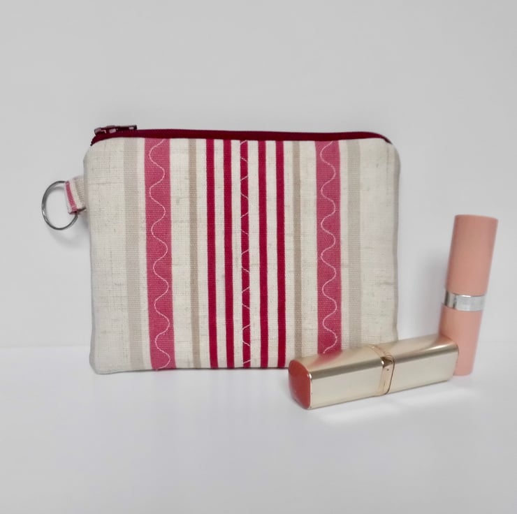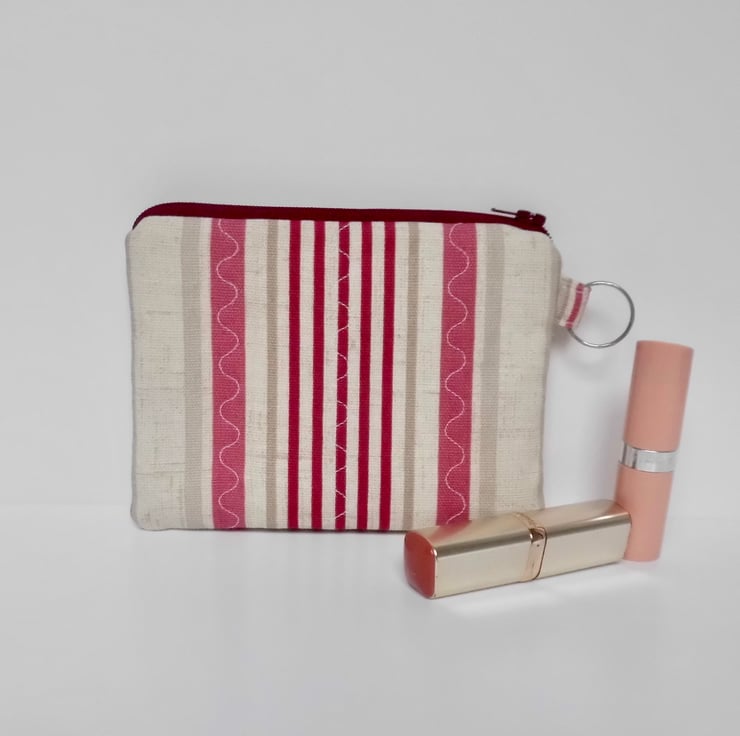 It has a burgundy zip closure and a small loop at the side with a key ring. The purse is perfect for carrying small items like lipstick, keys, and cash.
