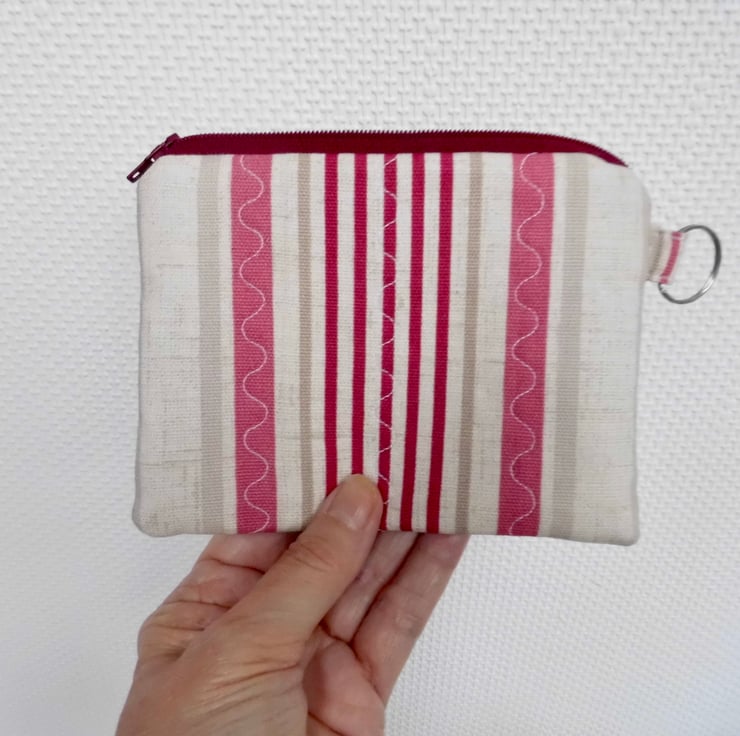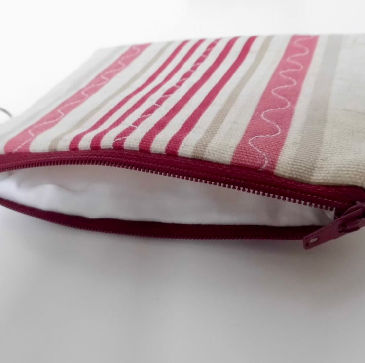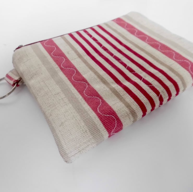 This purse is made with a furnishing weight cotton fabric with pink and beige vertical stripes. I backed this fabric with felt and then machine stitched down each side with three rows of wave stitch to achieve a lightly quilted effect. It is lined with plain white cotton.
