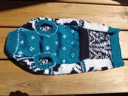 Unique fair-isle dog jumper designed and hand-knitted in Devon. Size medium, suitable for a medium sized terrier or dachshund - length 34cm, chest 38cm. 100% machine washable pure new wool in a range of vibrant colours and imaginative designs. Keep your faithful friend cosy this season!