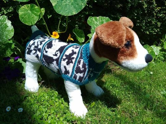 A traditional look for Titus with this Scandi-style folk pattern, featuring dogs and humans in a harmonious household of knitted bliss!