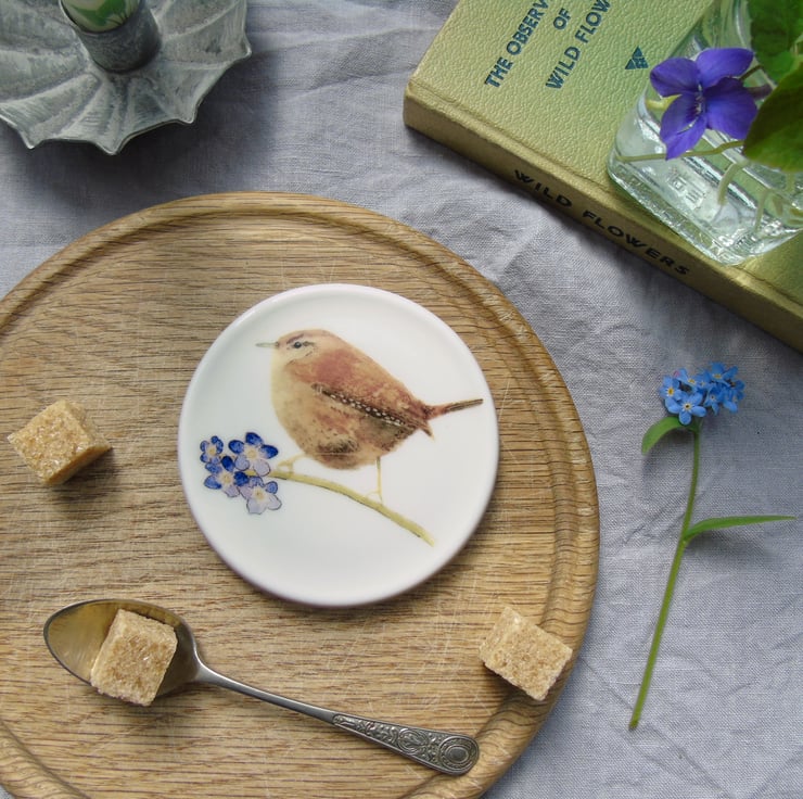 Hand decorated bone china coaster with my cute wren and forget me not flowers watercolour paintings, a lovely small token gift for gardeners and bird lovers. My illustrations are professionally printed onto ceramic transfers which I cut and apply by hand to each coaster. They have a slight rim so are also equally suitable to use as a spoon rest.