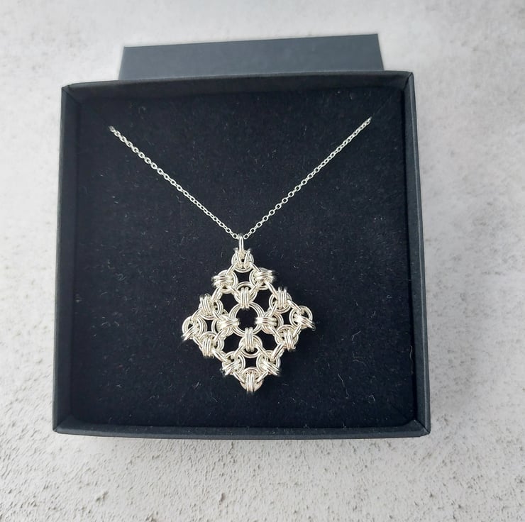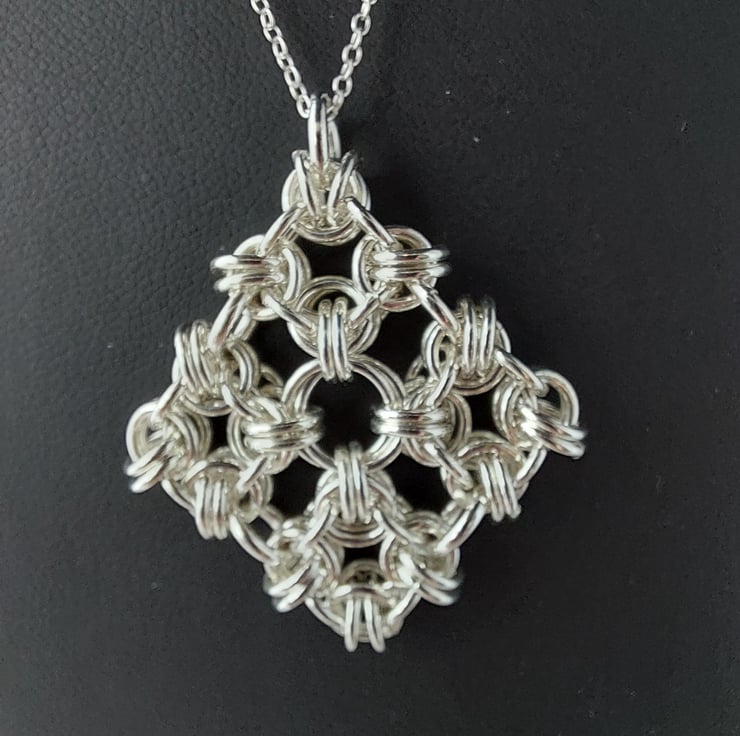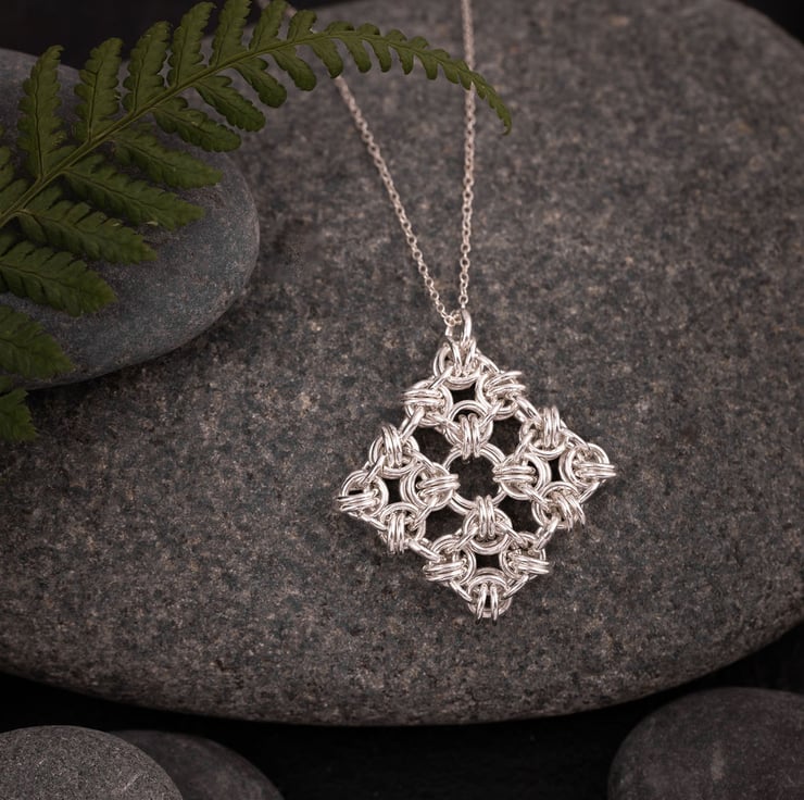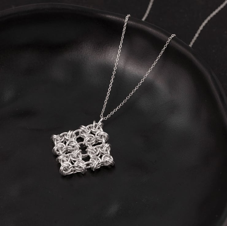 A gorgeous sterling silver pendant made from a chainmaille weave called B2G that is formed into a square. Made from sterling silver jump rings individually linked together.