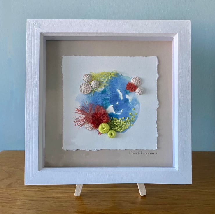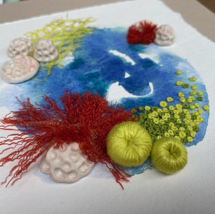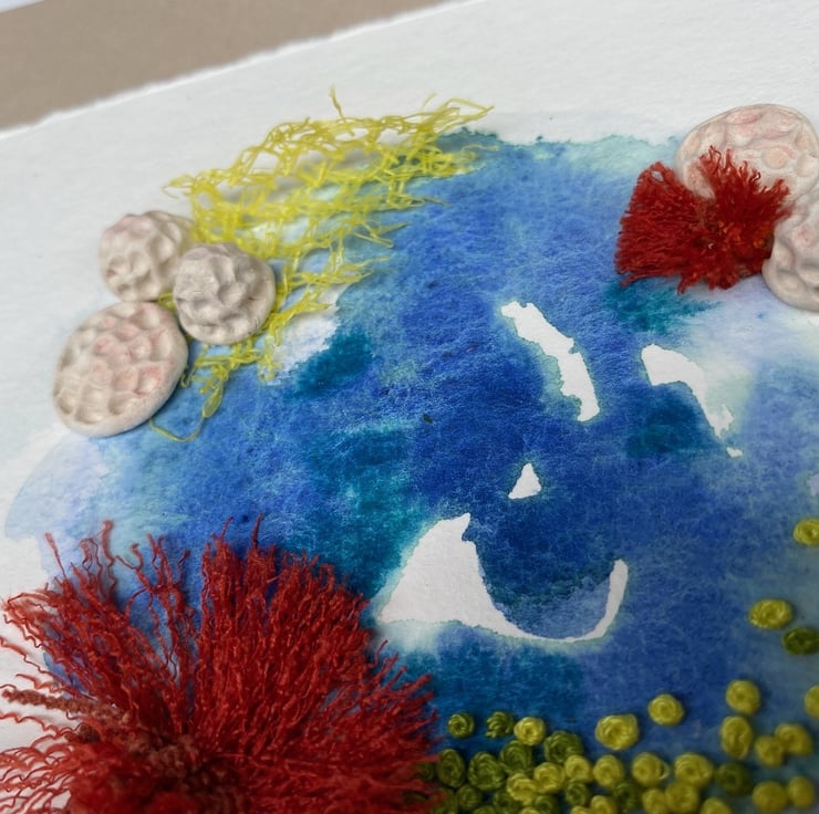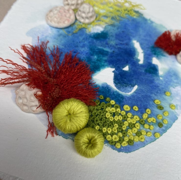 I have used painted clay, textiles and embroidery on a painted background in this work. I have used different media to convey a sense of movement and depth.