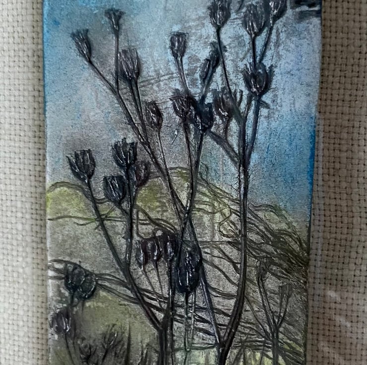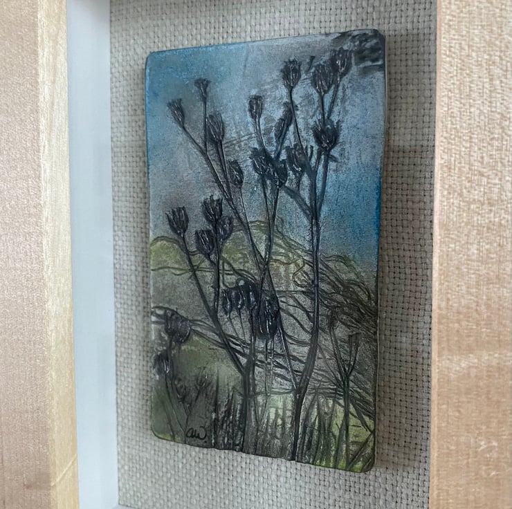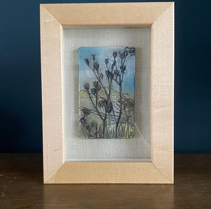 Seedheads are imprinted into clay and left to dry. Paint is added to give the impression of a vintage woodcut image. A unique and lasting piece of art that's a bit different.