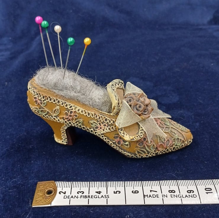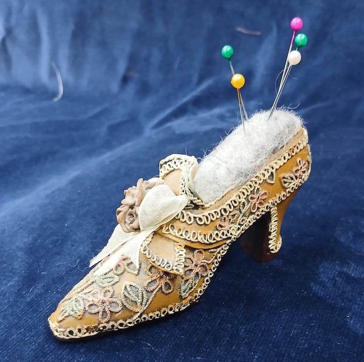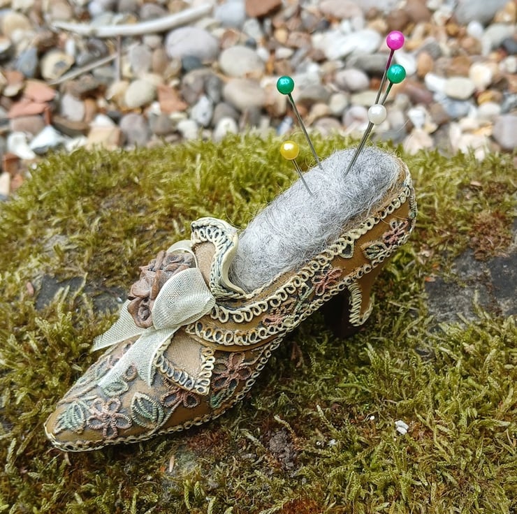 My inspiration for this pin cushion is the antique often silver ones that occasionally come up for sale, this is a more affordable option. The shoe is porcelain, antique in style with a felted wool pad for the needles to sit.