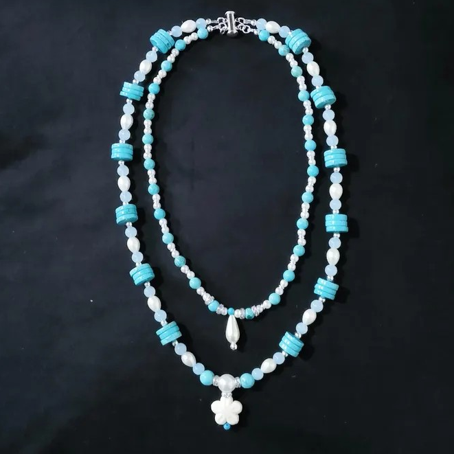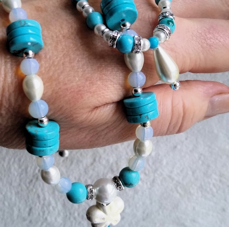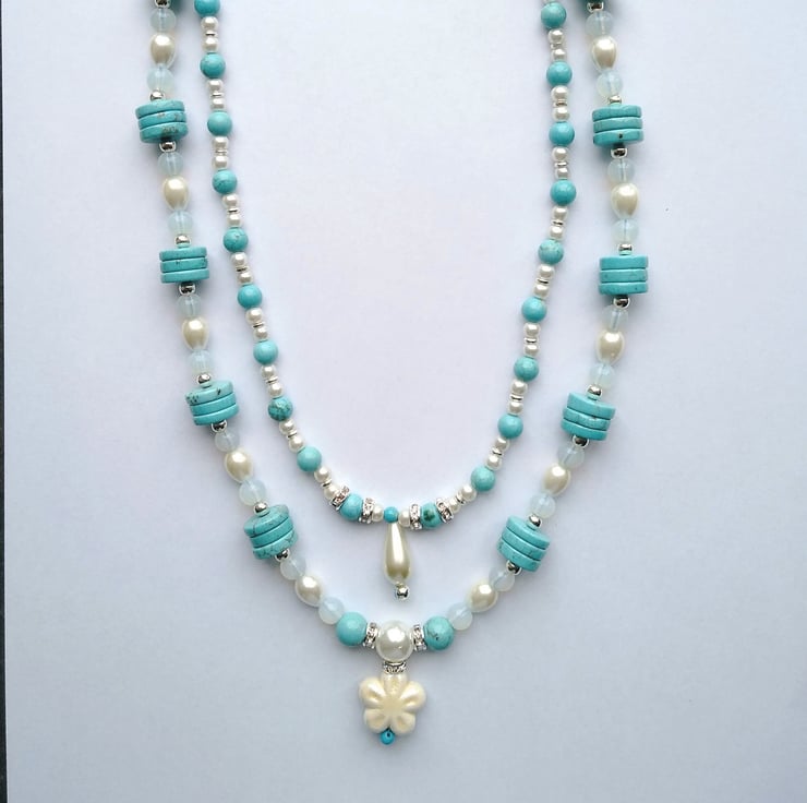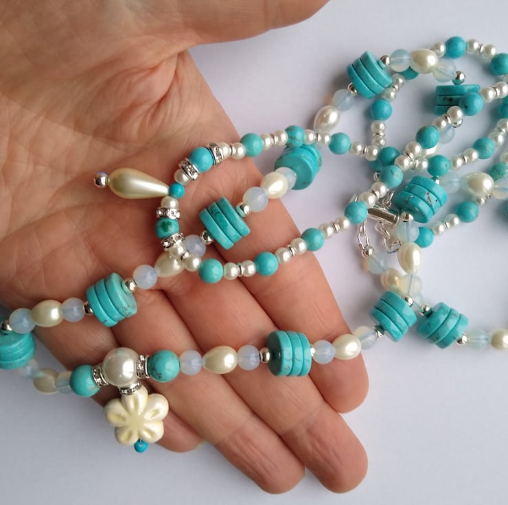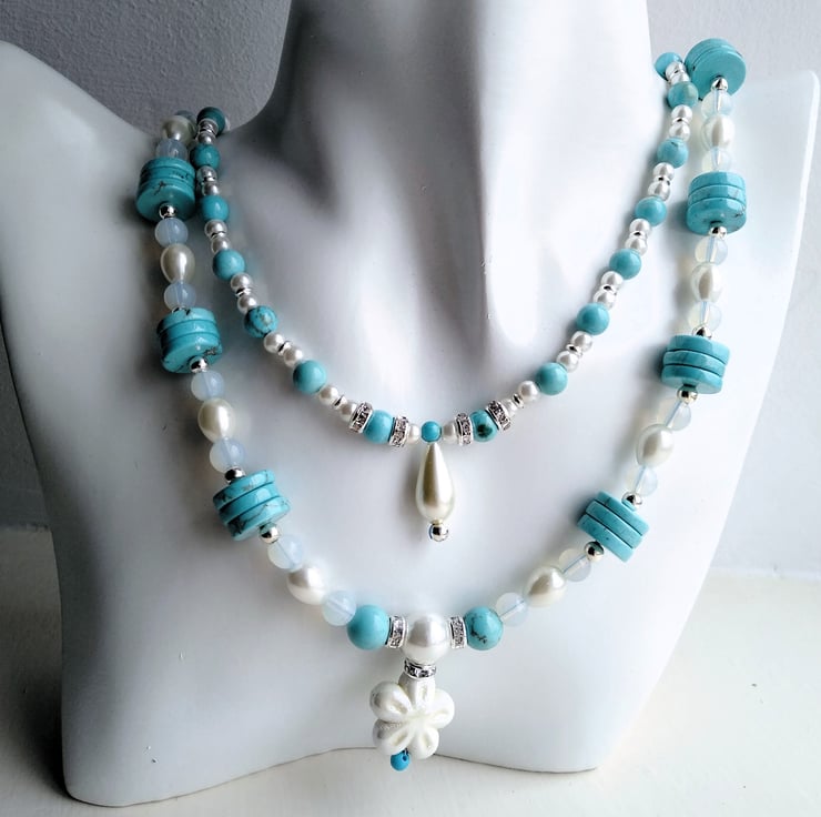 Stunning two strands of tropical sea, turquoise coloured Magnesite large heshi and round beads interspersed with glass pearls, glass opalite beads and silver plated metal beads. Both strands have a charm feature, to complete the design, one being a ceramic flower the other a glass pearl drop. The combination of the turquoise and the white makes this a bright eye catching necklace, ideal for summer wear, for a special occasion or more casual.