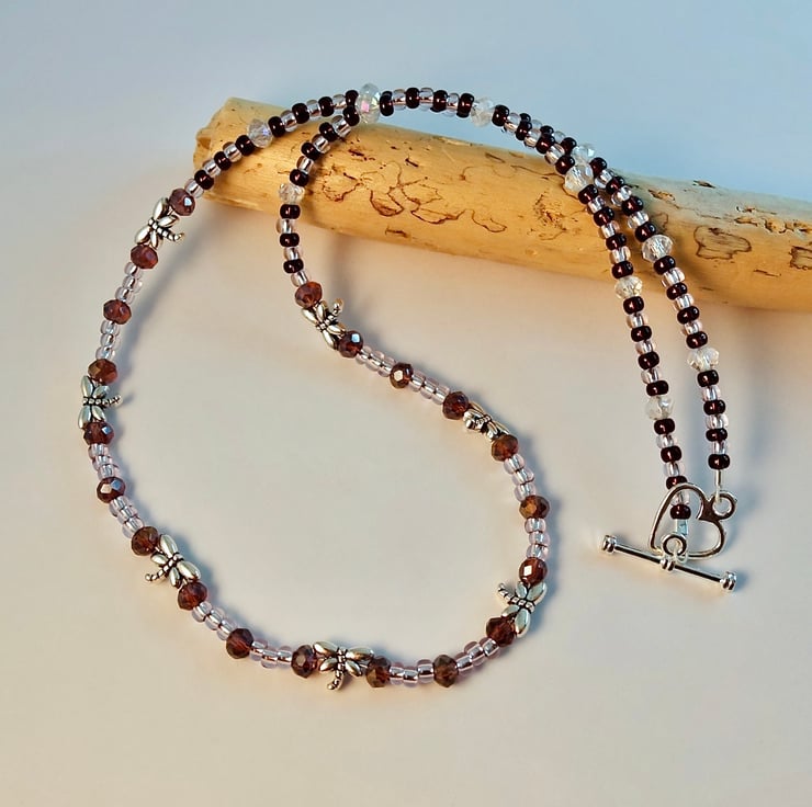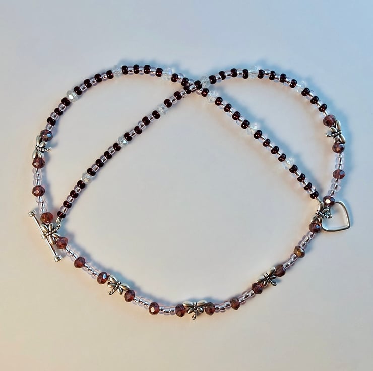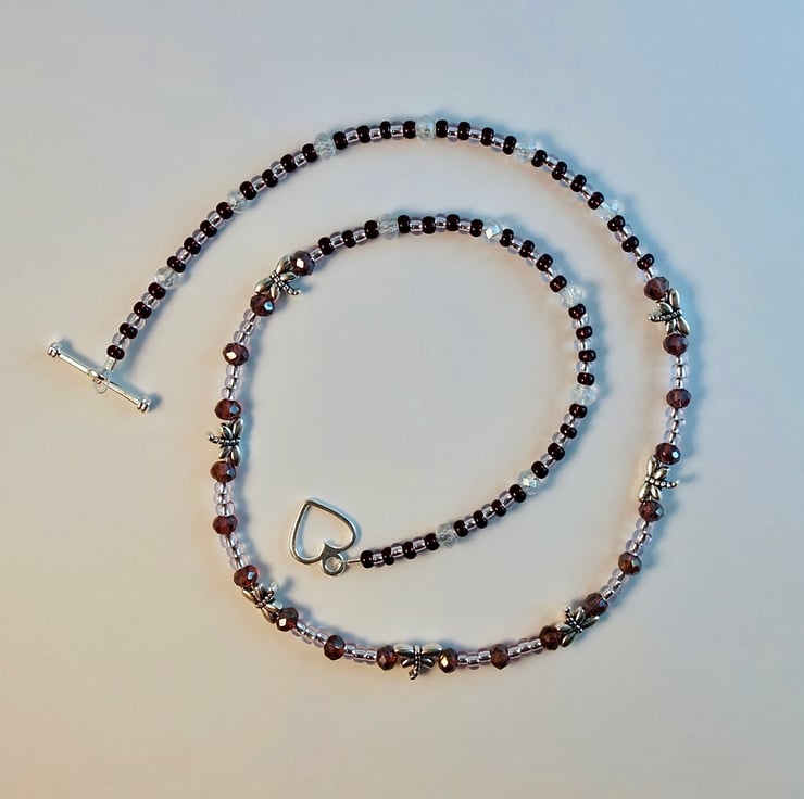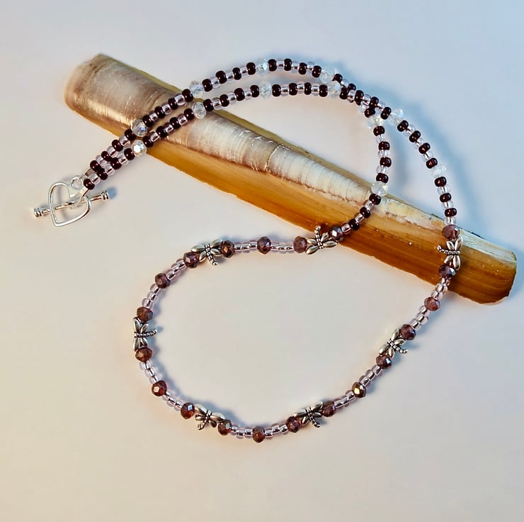 The necklace is threaded with tiny 2mm silver lined Czech glass seed beads in lilac and amethyst colours, 3x4mm sparkly faceted glass plum and crystal AB rondelles, and seven 8mm Tibetan silver dragonfly beads.