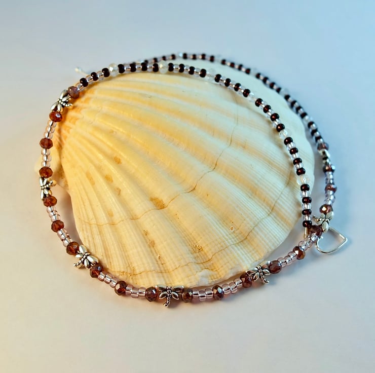 This sparkly necklace, in shades of pale pink, purple and silver, is made from seed beads, faceted glass and Tibetan silver dragonfly beads.