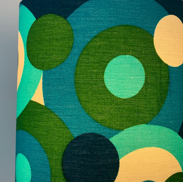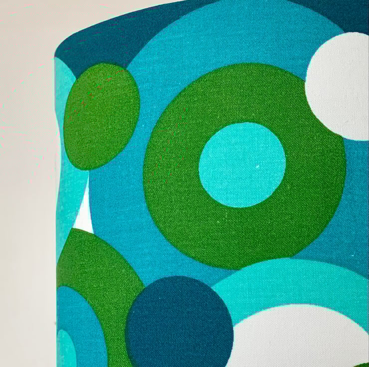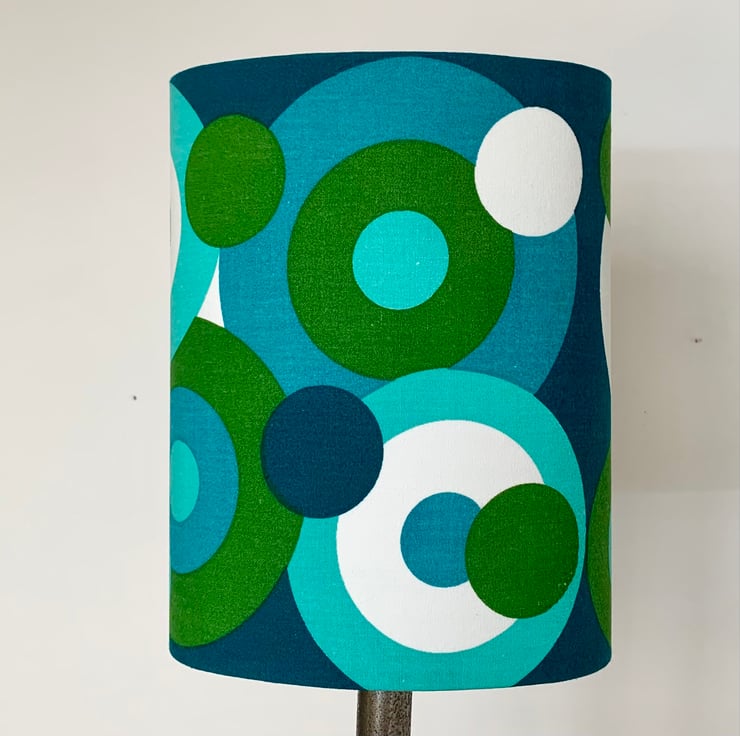 RETRO Op Art Circles 60s LIZA CALEY 'MAGPIE' Teal Green Vintage Fabric Lampshade - Dramatic fabric choice for a lampshade in a modern or retro home.