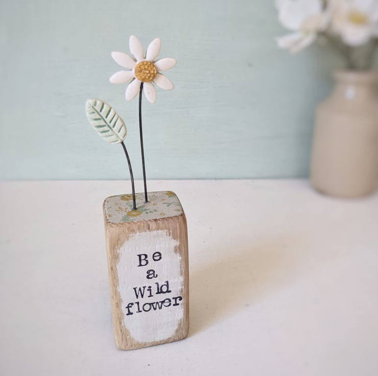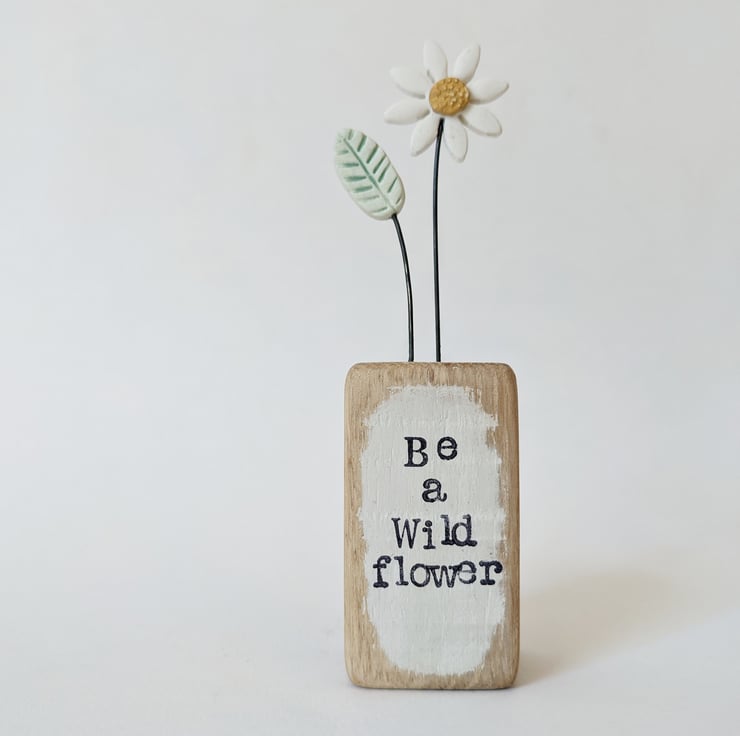 The front of the wooden block is hand stamped with the words 'Be a Wild flower.
