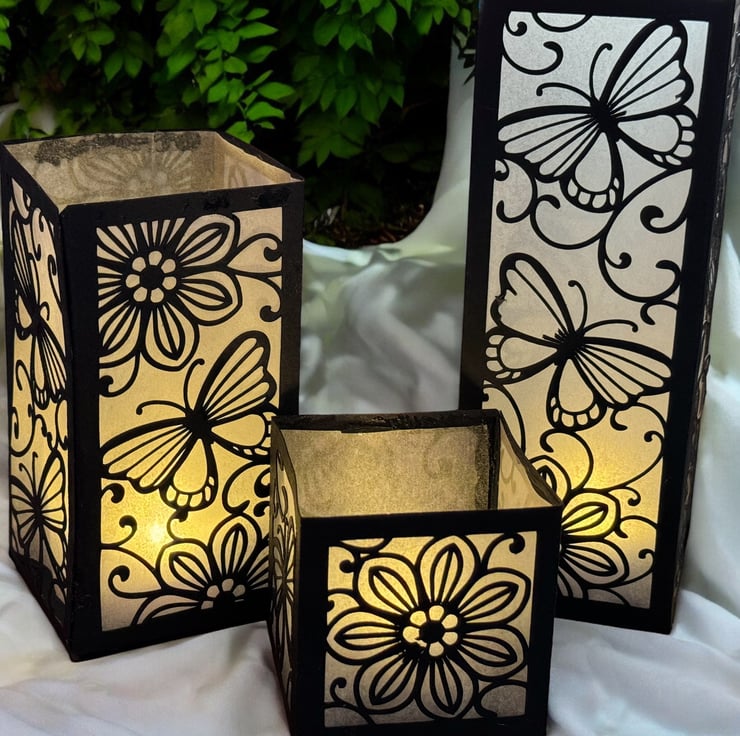 Very pretty lanterns made with 220 gsm black card and backed with vellum paper……