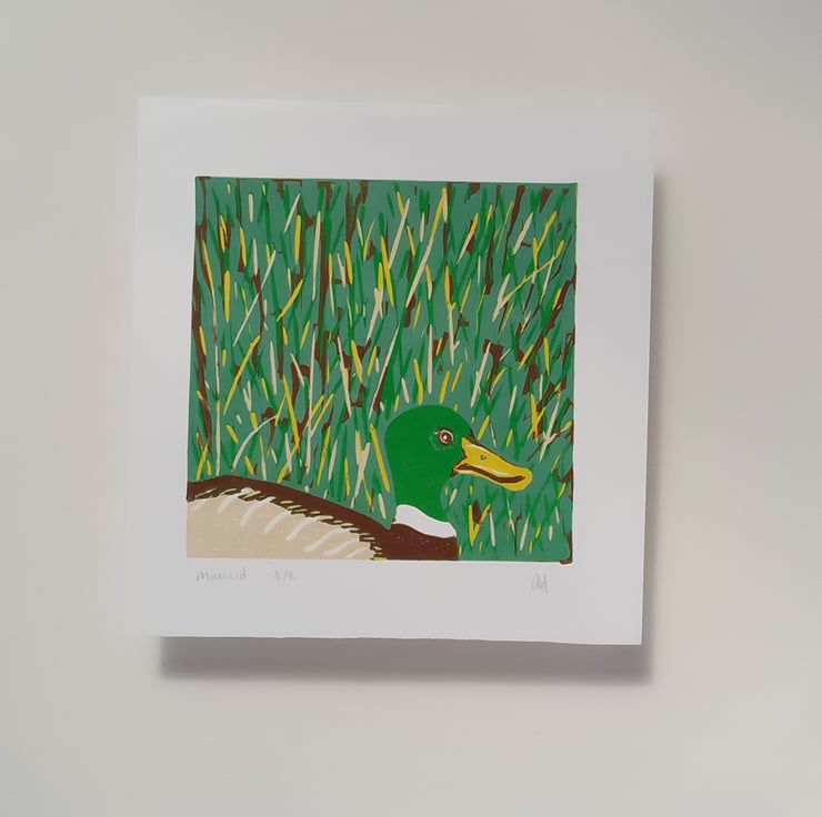 A small linoprint of a mallard duck, the image is 10cm square printed on white Bristol board. It is another in my series of mini reduction linoprint featuring birds from the Somerset levels. This is a limited edition of 8. It is unmounted for you to frame.
