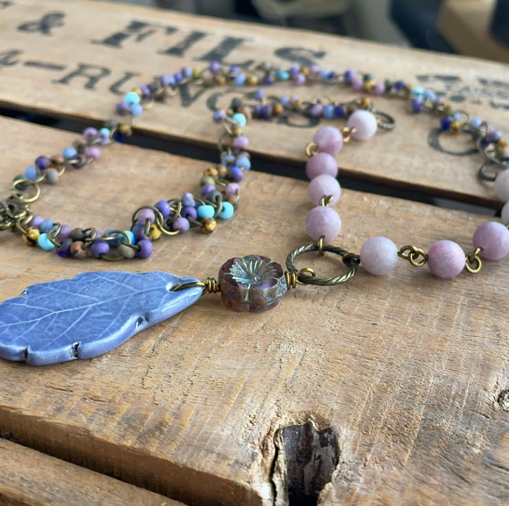 Artisan Ceramic Leaf Pendant. Bohemian Necklace with Multi Coloured Beaded Chain