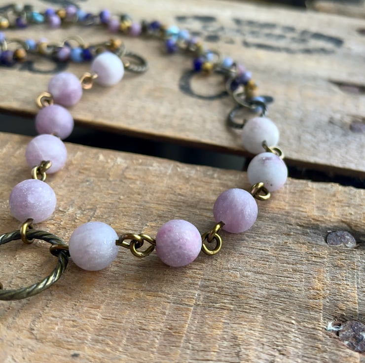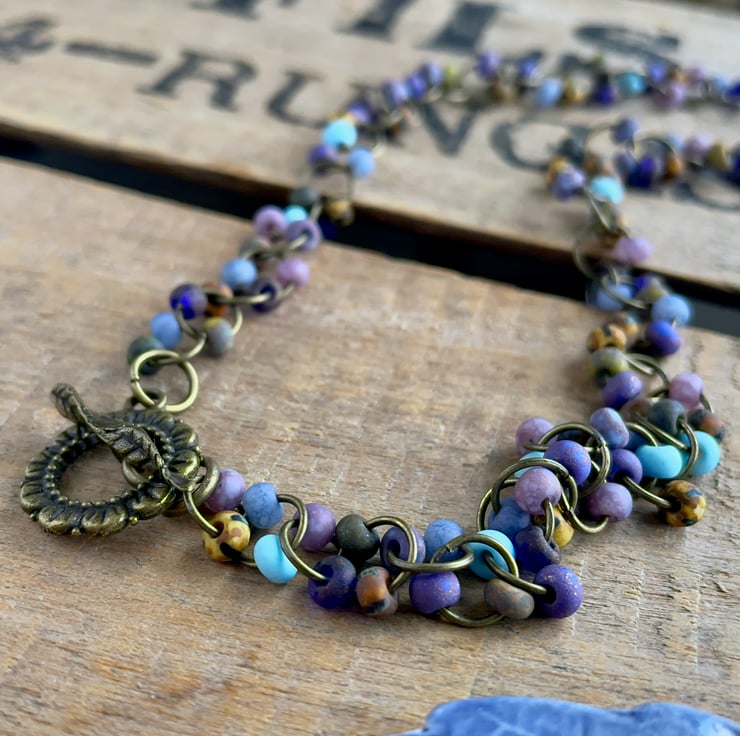 At the front of the necklace, frosted lilac rounds are carefully linked together one by one, and the back is finished with a multi-coloured handmade seed bead chain.