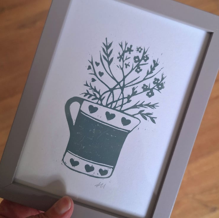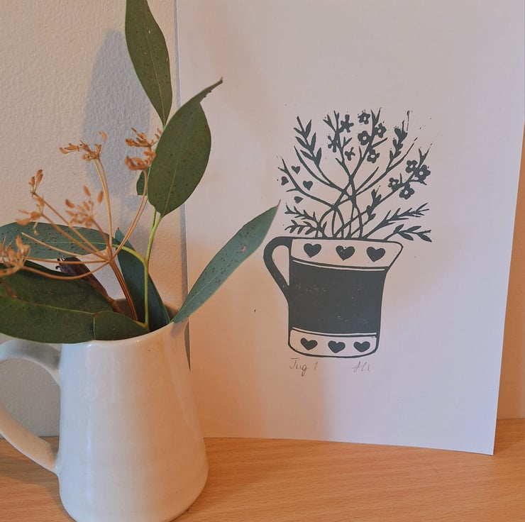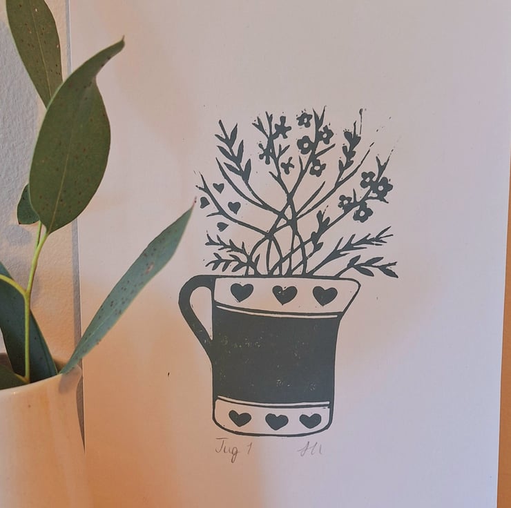 The local countryside and all the beautiful hedgerow plants that it offers inspires my prints. I was commissioned to create 2 matching prints for a sage green kitchen with a jug theme and this is one of 2 designed, carved and printed.