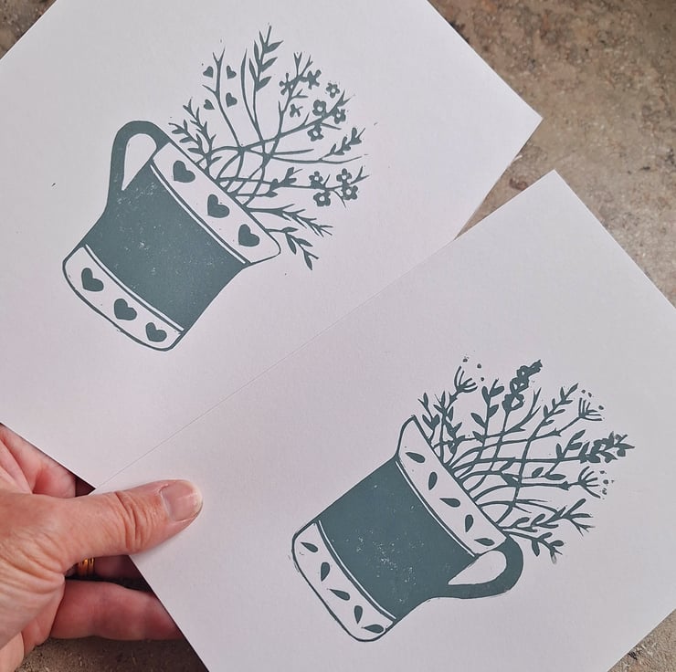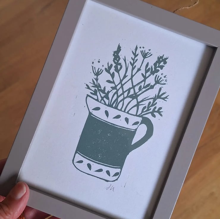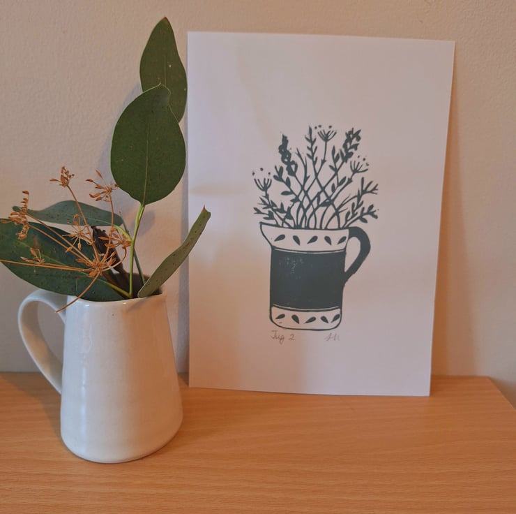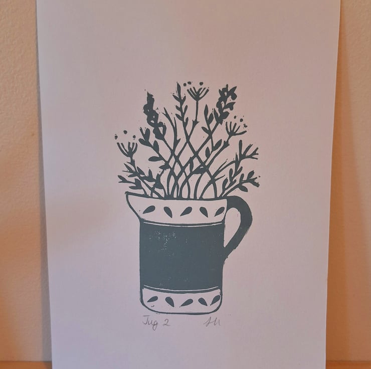 The local countryside and all the beautiful hedgerow plants that it offers inspires my prints. I was commissioned to create 2 matching prints for a sage green kitchen with a jug theme and this is one of 2 designed, carved and printed.