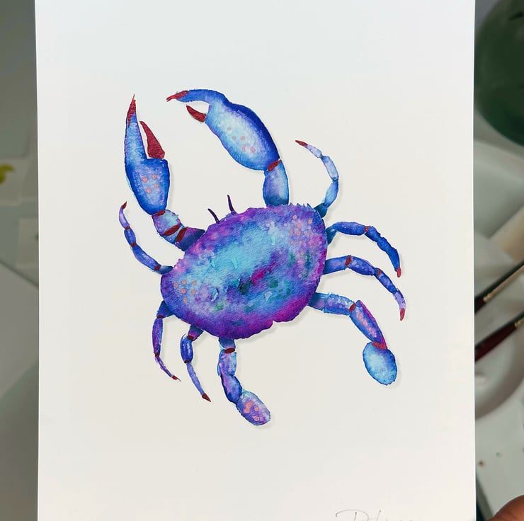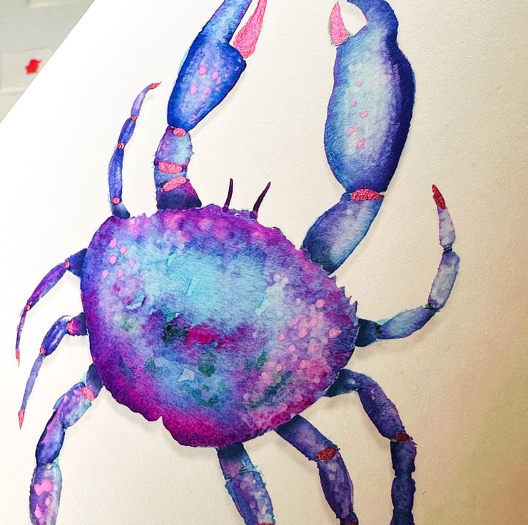 I love the multi colour shells on crabs and the texture. So I do love to capture some of that essence in watercolour painting, with a dash of abstract and some elements of metallic paint for good measure. I love the vibrancy in this hand finished art. The colours are amazing especially with the metallic paint additions. I love it so much I added my signature to this unique piece.