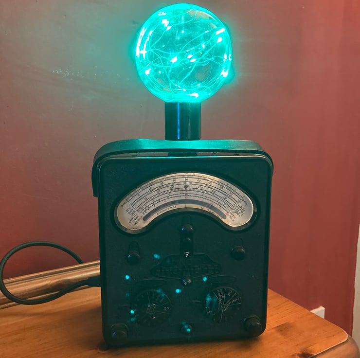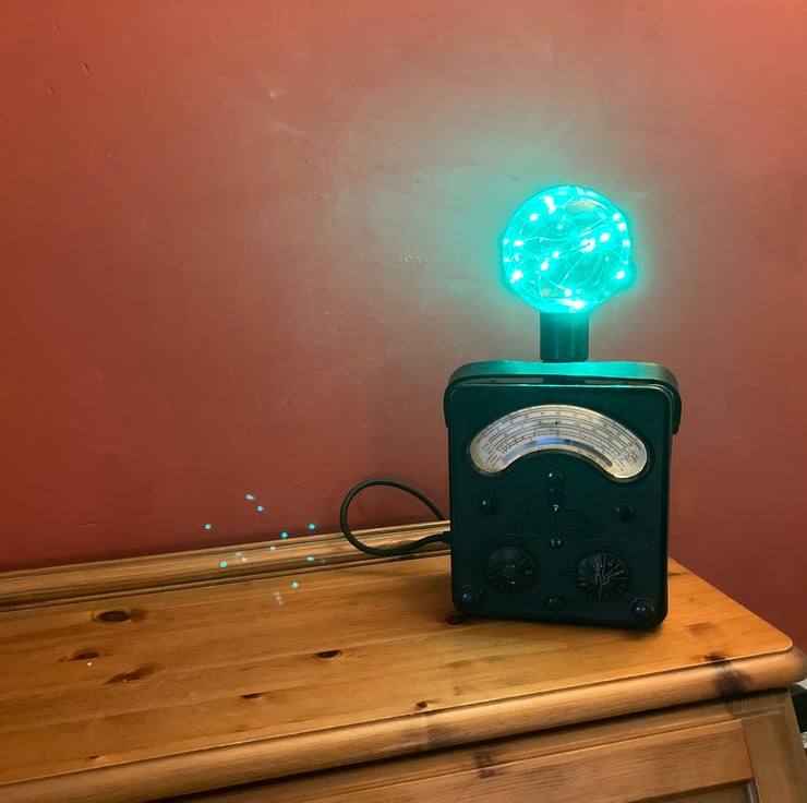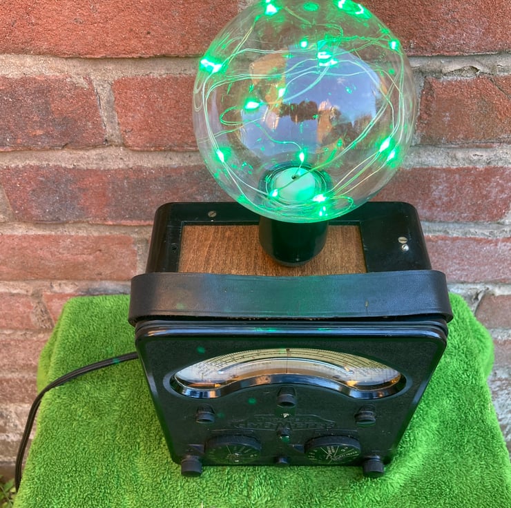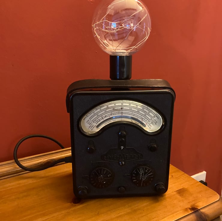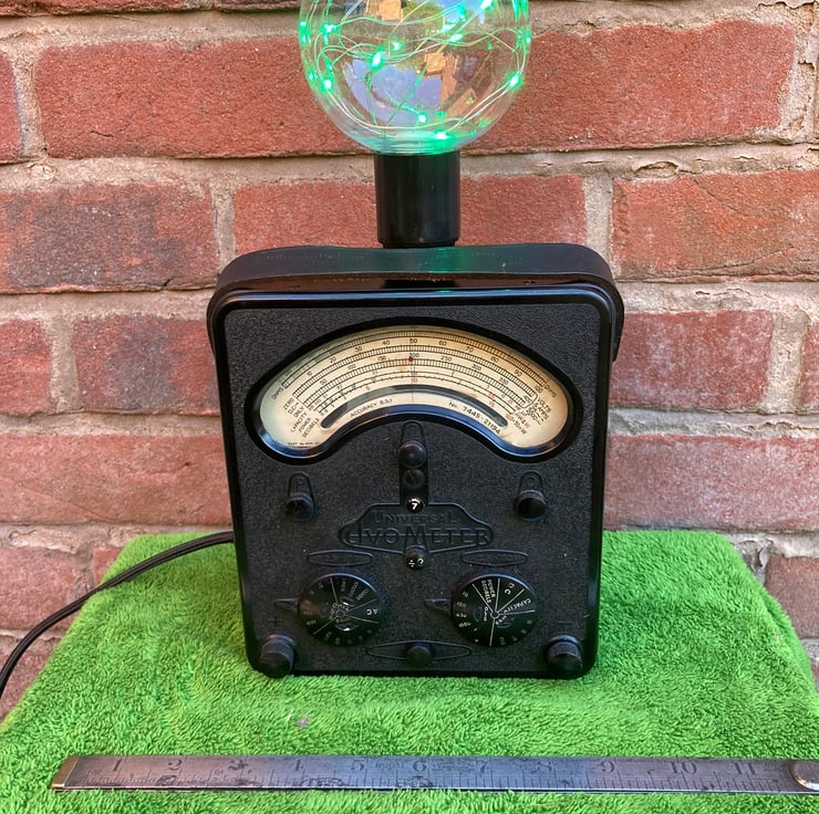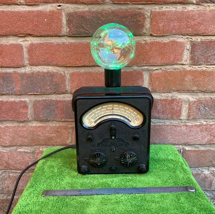 These AVO Bakelite electrical test meters have such a distinctive gothic look that when I saw this one, I knew it would make a stunning conversation piece lamp to gently light your room with a vintage steampunk glow.
