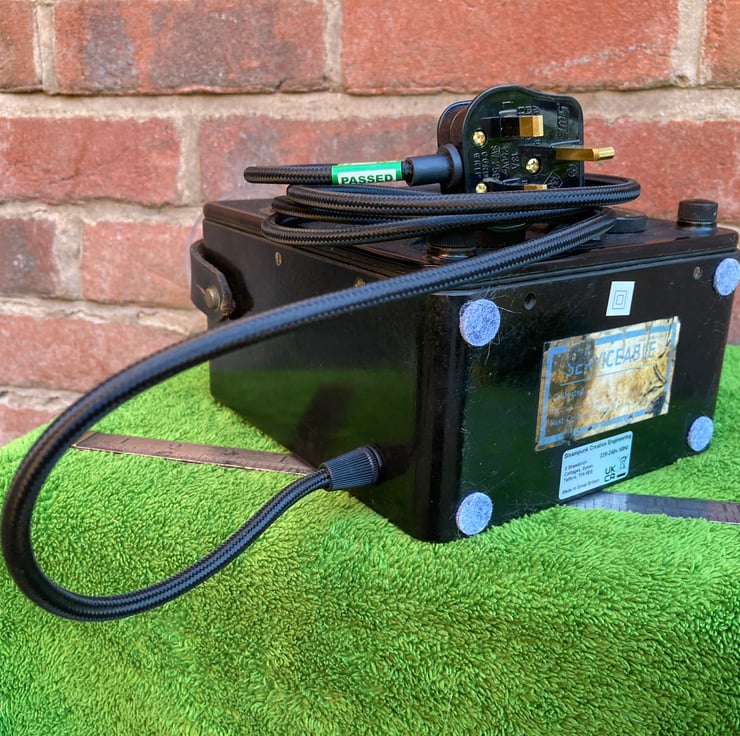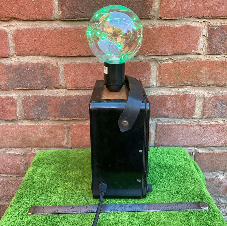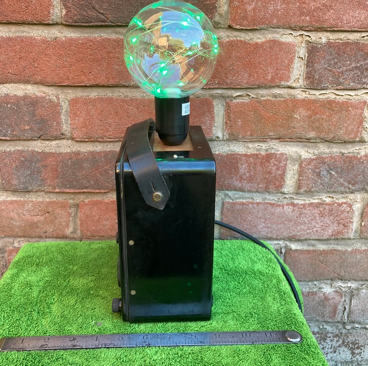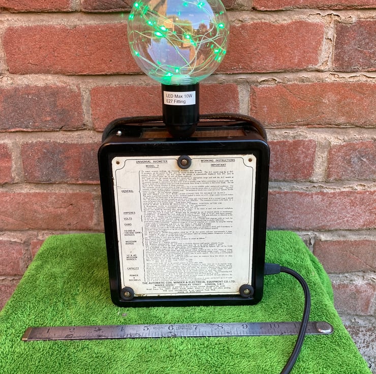 I have removed the windings, transformer and internal wiring and converted the meter into a safe and highly decorative table lamp. An ES (E27) lampholder is mounted to a wooden panel covering the battery box aperture and the original DC selector dial is used as a switch for this main lamp. A second lamp, this time an SES fitting mini globe bulb, is inside the unit to light the characteristic AVO curved meter dial. This is switched by the AC selector dial. Both switches were checked before use. 6 feet/1.8 metres of luxury new but period look black braided flex with a black UK plug complete this charismatic lamp.