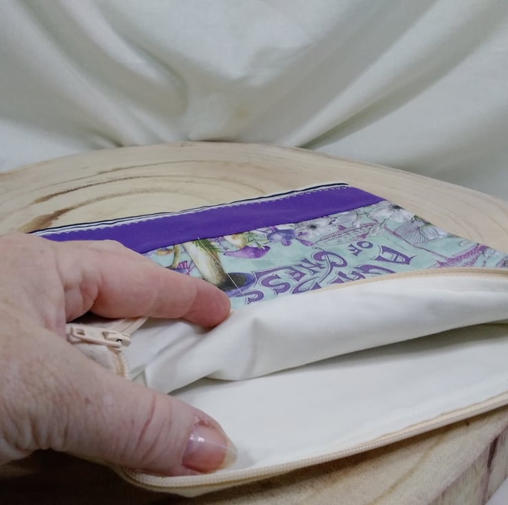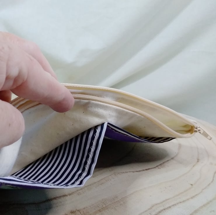 This bag is made in a beautifully simple, neutral ,cotton calico outer with a full width double pocket on the front. Featuring an image of ALICE and the CATERPILLAR in a fabulous illustration in purples and turquoise 100% cotton makes this cosmetic bag really stand out ! The pocket is lined with a navy and white pinstripe cotton and divided into two to keep smaller items snug.