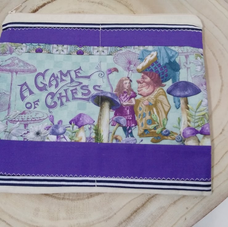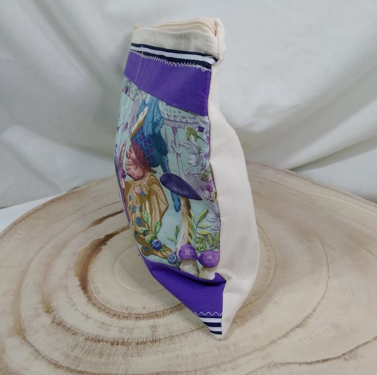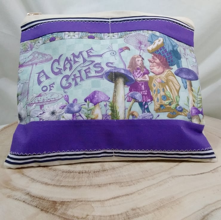 A very distinctive zipped cosmetic bag with ALICE IN WONDERLAND THEME fabric.