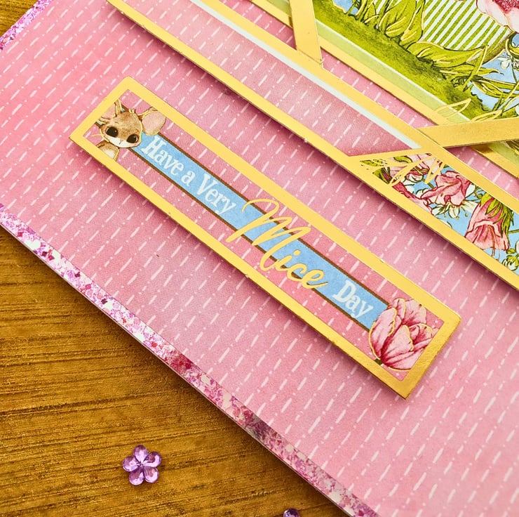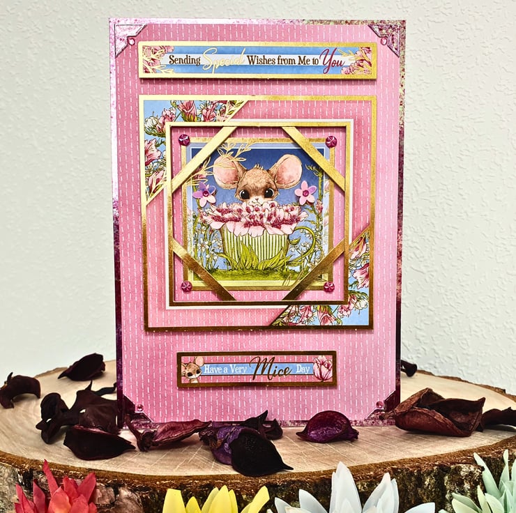 The card consists of mats & layers of magenta mirror card & pink cardstock with white stitched line pattern. The main square topper is placed in the middle, surrounded by matching, gold foiled frames. The sentiment "Sending Special Wishes From Me To You" is displayed above the main topper, while the sentiment "Have A Very Mice Day" is underneath it. The card is embellished with gemstones, diamante, glitter colour drops & 3D flower elements. It is finished with coordinating inserts, blank, for you to add your own messages and wishes. Decorative photo corners give a unique touch to the card.