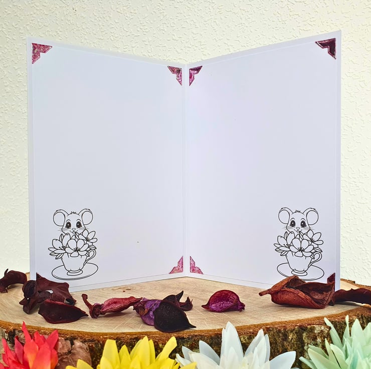 Make someone's day special with this sweet card, handcrafted with attention to detail for a lasting impression. It features an adorable mouse peeping behind a pot of pink flowers, ready to deliver your wishes for a special occasion!