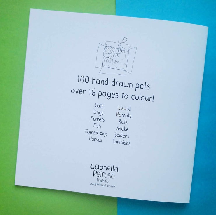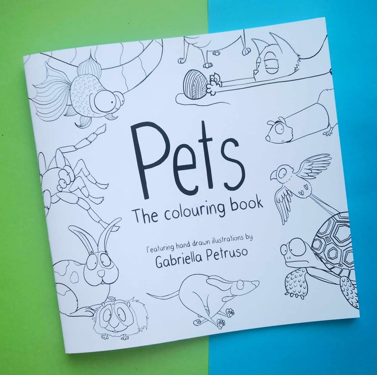 21x21cm colouring book featuring hand drawn illustrations of a menagerie of pets! Printed on high quality, thick 160gsm recycled paper.