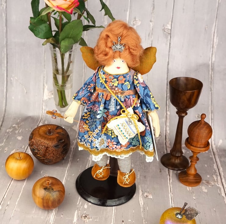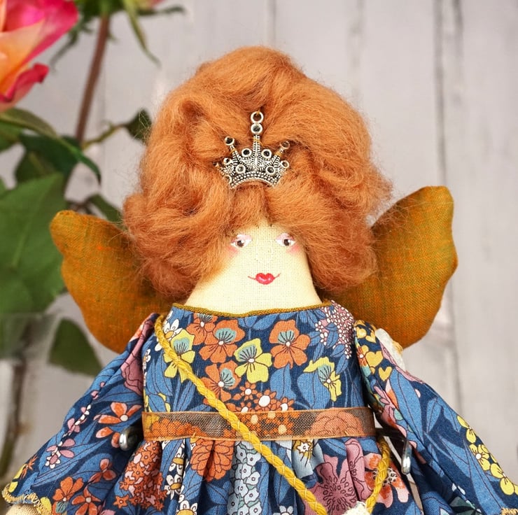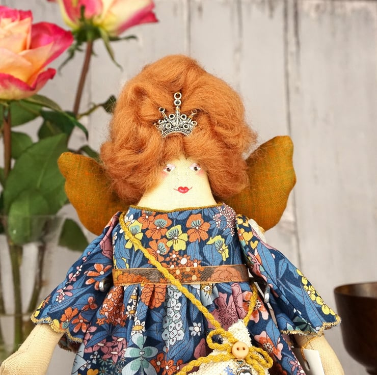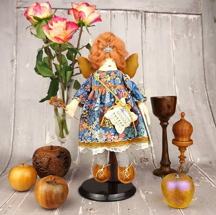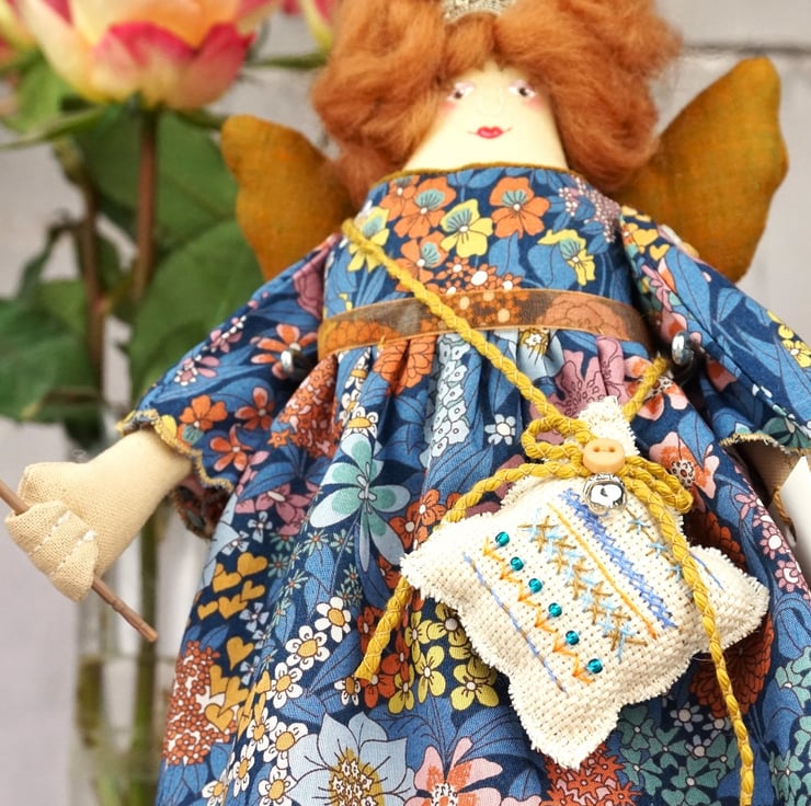 This is Hilde. A smaller pattern, she is about two thirds the size of my witch. This little Fairy God Mother has a Liberty tana lawn print dress in blues and oranges called Ciara Blue. She has wings that match her underskirt and sports a little felt wand. Her shoes are the smallest I have ever made and are leather. She has a piece of carnelian to her heart with chamomile flowers in her stuffing and is finished with tiny buttons, spiced apricot organza ribbon and a little coronet in her hair.