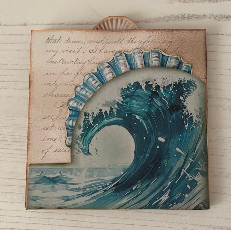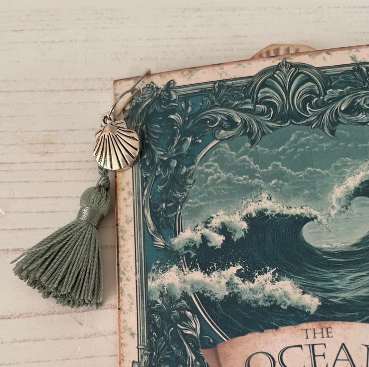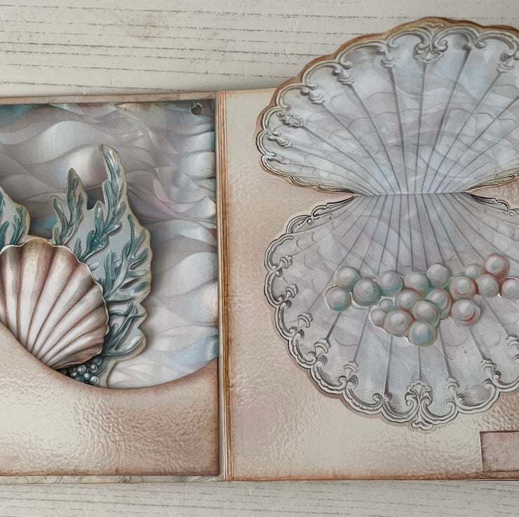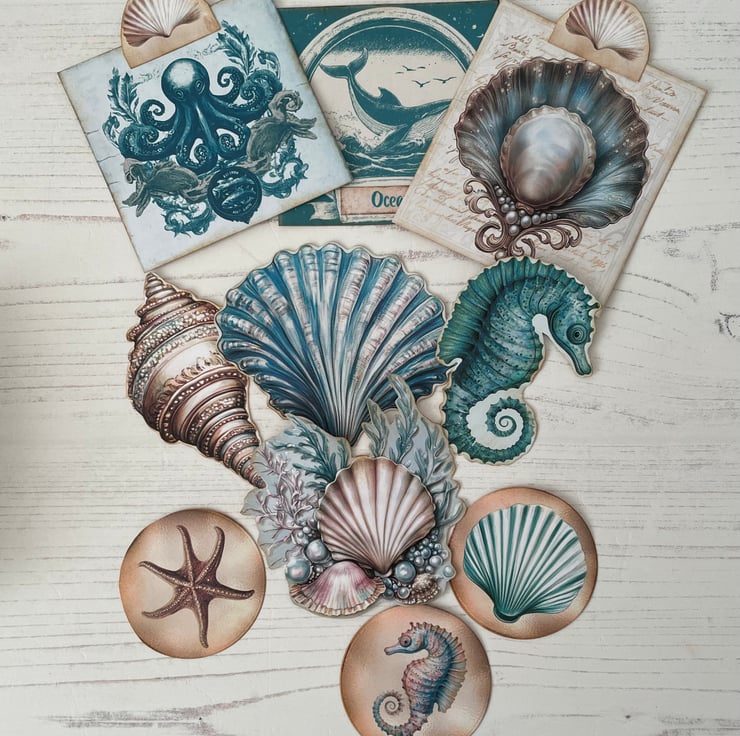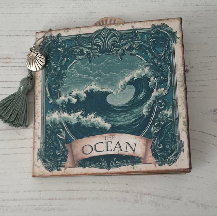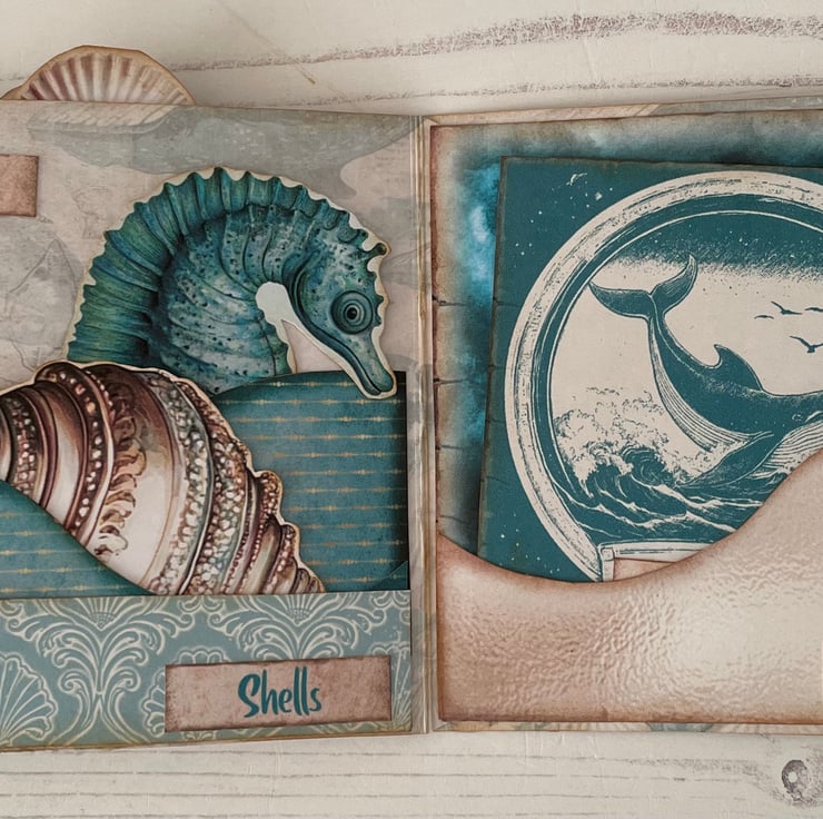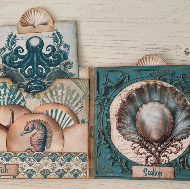 Small but perfectly formed Ocean themed mini folio. Shell charm and tassel on the front secured by a bulb pin. Inner pages, pocket with fussy cut and shell tags. Oyster shell opens to reveal a cluster of pearls. Pocket and tuck spot for octopus tag and round tags: starfish, shell and seahorse. Window pocket with removable tag shell image. 3 pockets seahorse and shell fussy cuts. Inside back cover pocket with whale tag. Sea pocket on the back contains a clam shell tag. Measures approx 4” x 4”