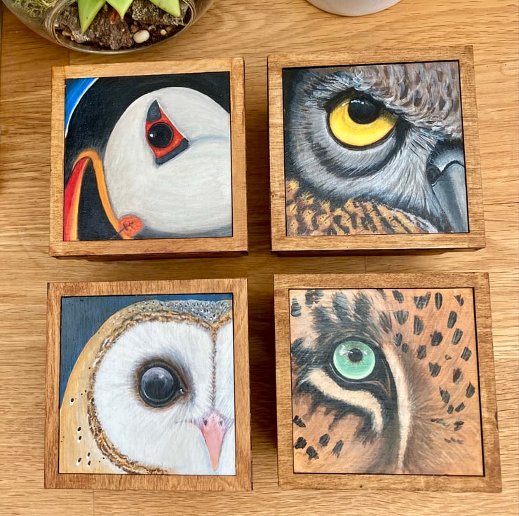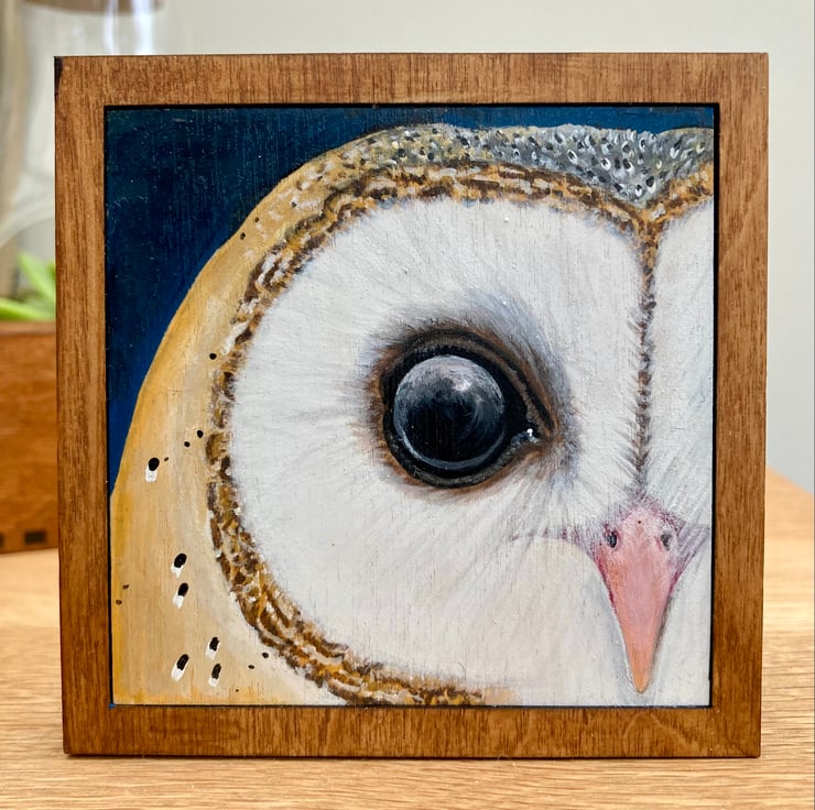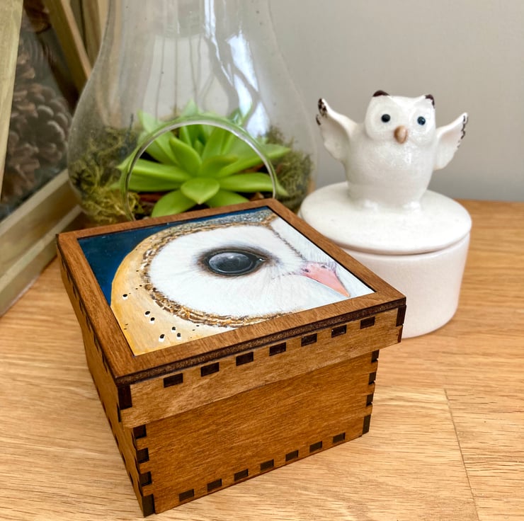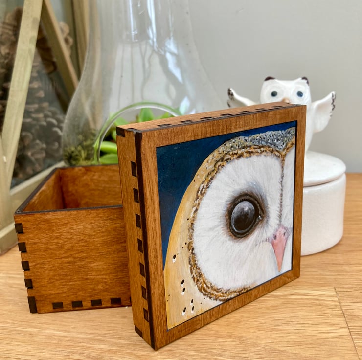 Lovely little plywood trinket box with a hand painted close up of a barn owls face.