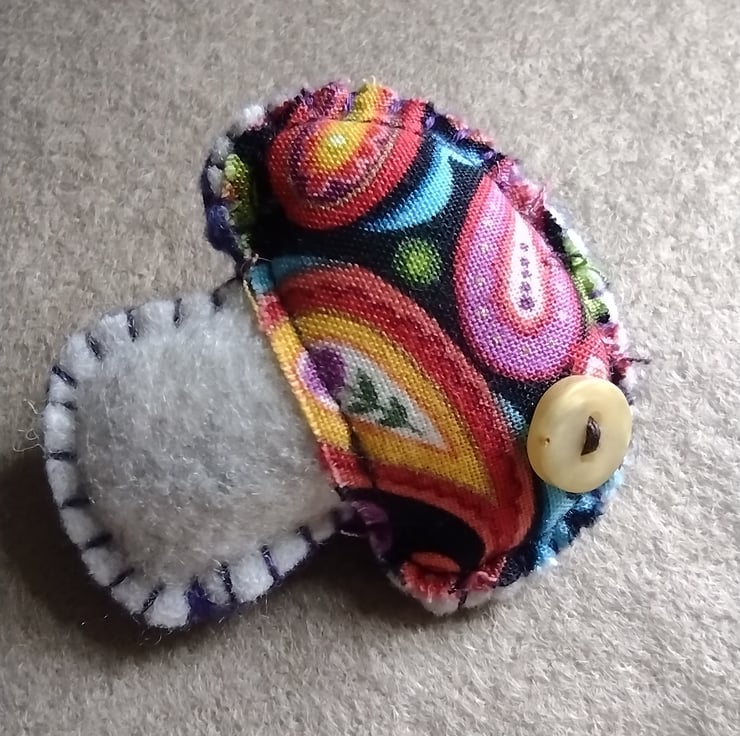 Soft felt and a pretty Paisley print cotton fabric are stitched together using both machine embroidery and hand stitching techniques to make this sweet little toadstool to adorn your outfit. A foundling button from my button jar is added, and the brooch back on the reverse has been thoroughly stitched to keep it securely fixed.