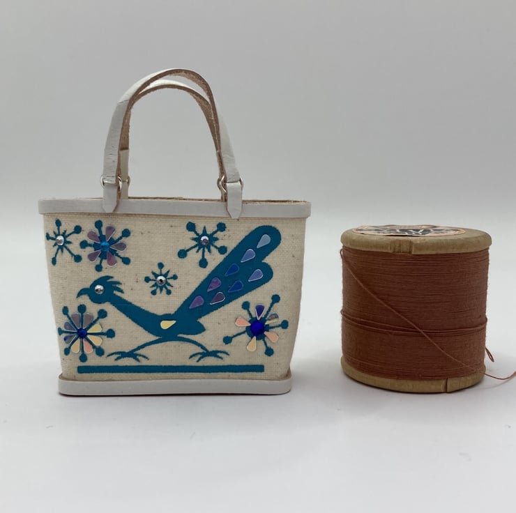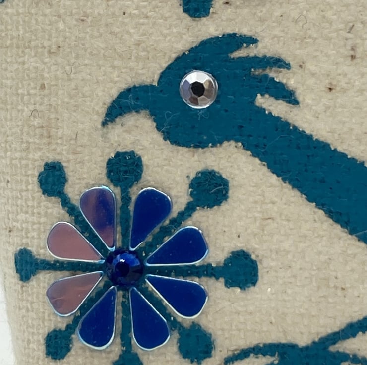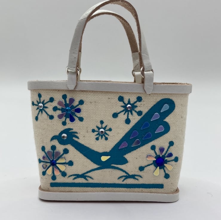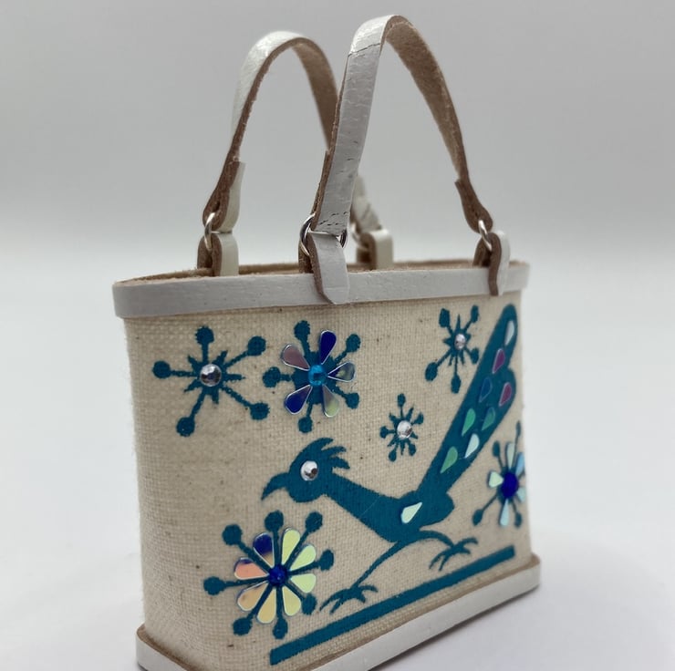 I have hand painted the roadrunner with acrylic paint and then embellished it with tiny jewels, the key signature for Enid Collins of Texas bags.