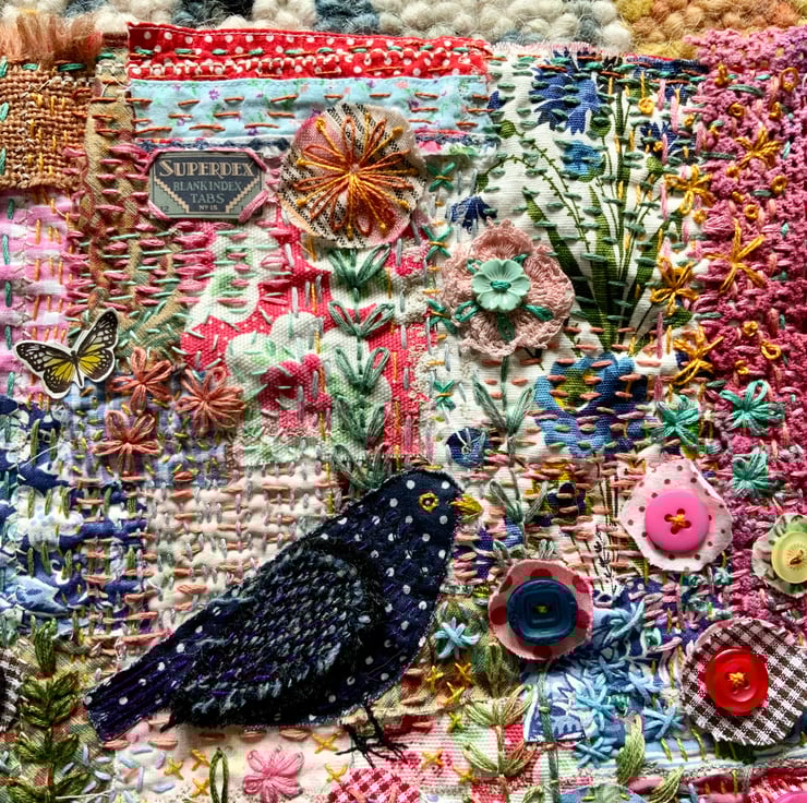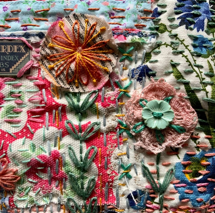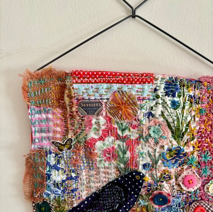This is a hand embroidered piece of textile art with some machine embroidery. It is made from small pieces of fabric, some vintage some recycled from clothes. Which I have patched together with hand and machine embroidery. There is a lot of hand embroidery and embellishment in this piece, it is one of a kind. It measures approximately 25 width x 30cm length and is 40cm in length including the hanger. It is a colourful piece and I hope it will brighten your home and make you happy. X