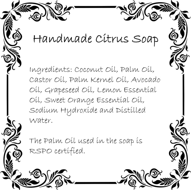 Coconut Oil, Palm Oil, Castor Oil, Palm Kernel Oil, Avocado Oil, Grapeseed Oil, Lemon Essential Oil, Sweet Orange Essential Oil, Sodium Hydroxide and Distilled Water.