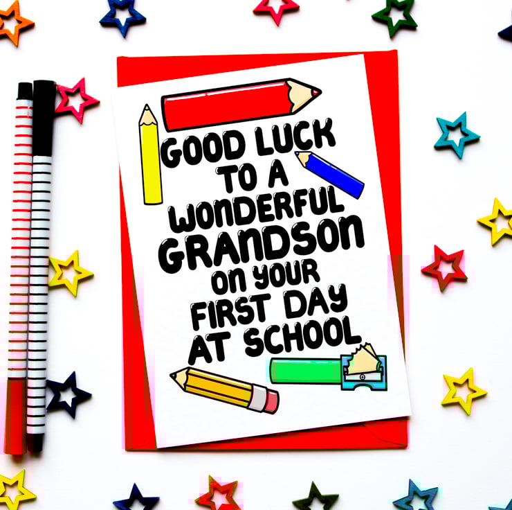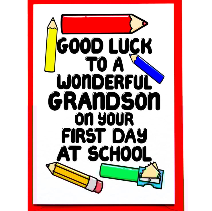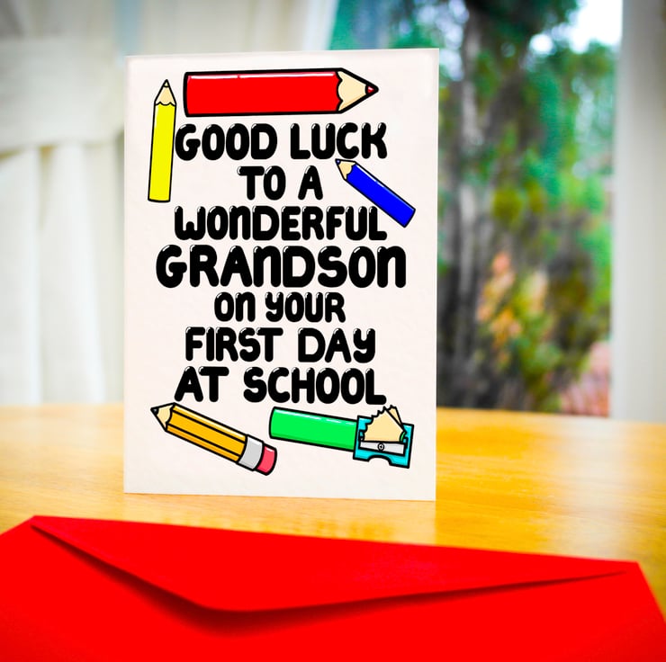 Greeting on front: GOOD LUCK TO A WONDERFUL GRANDSON ON YOUR FIRST DAY OF SCHOOL