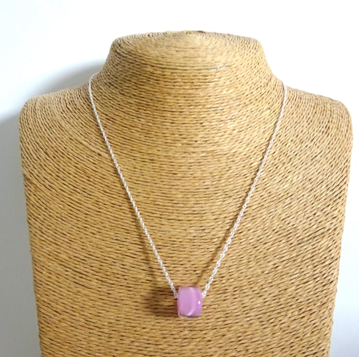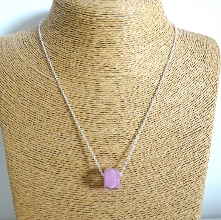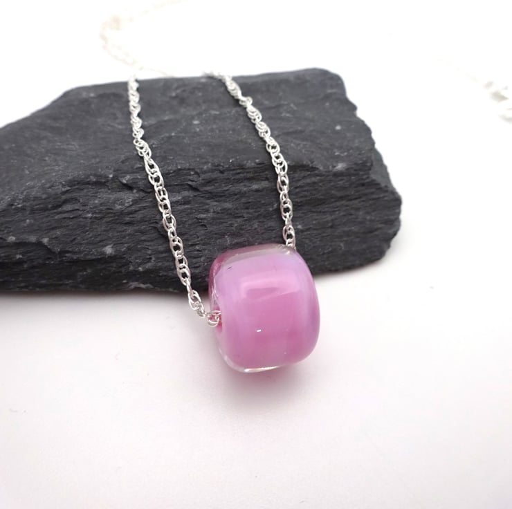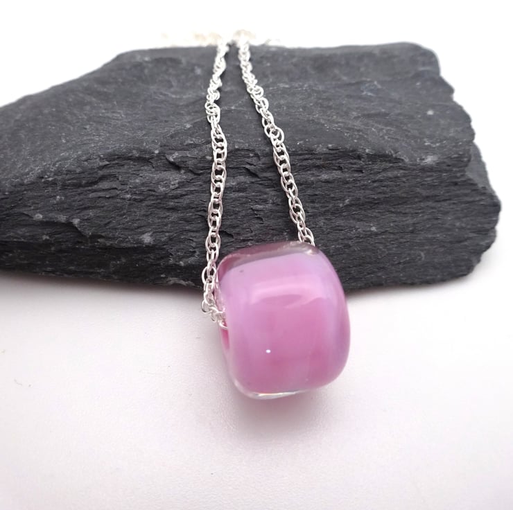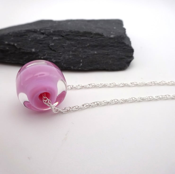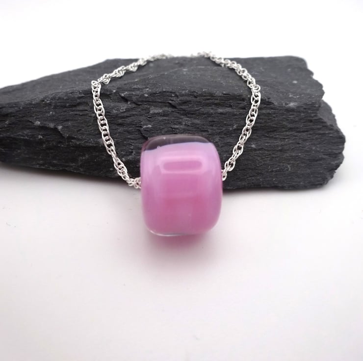 It features a sterling silver chain strung with a handmade lampwork glass pink bead.
