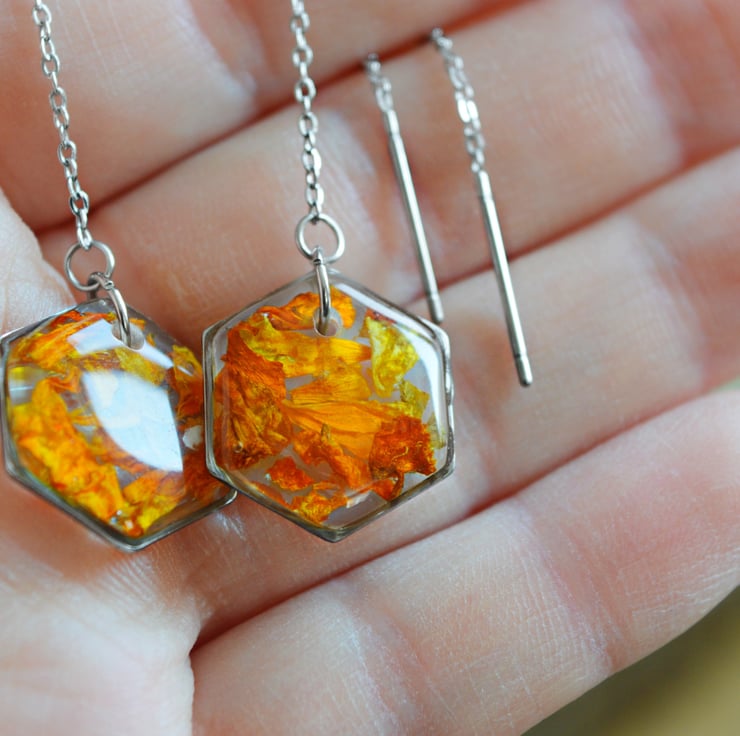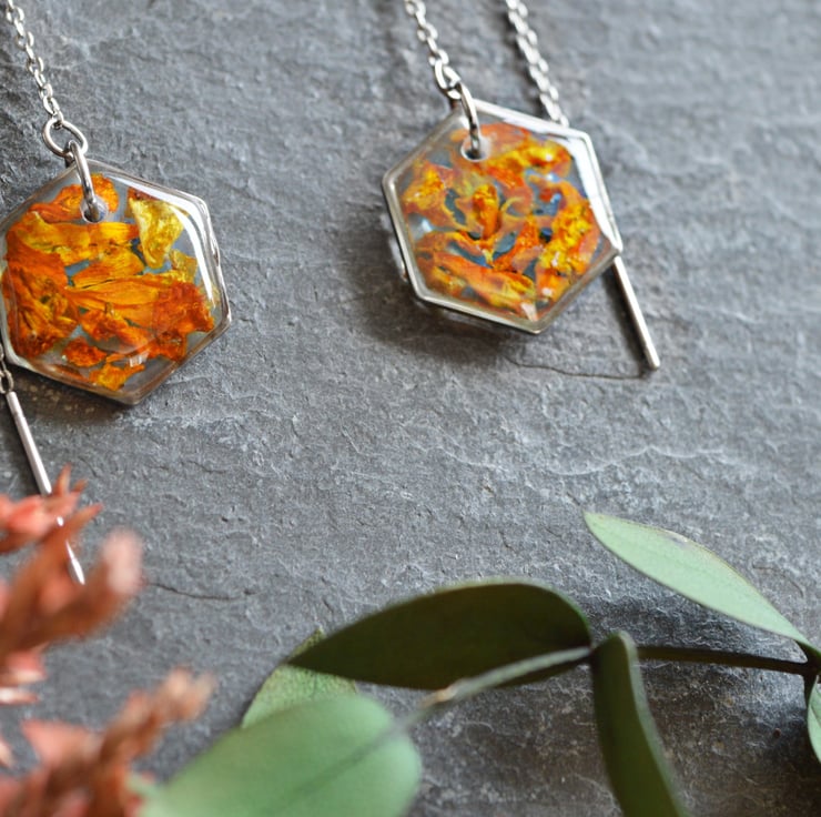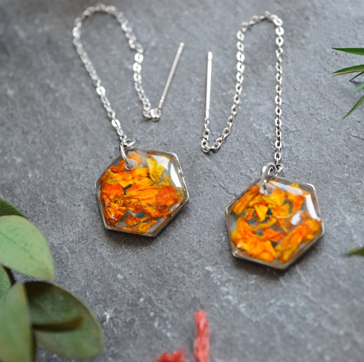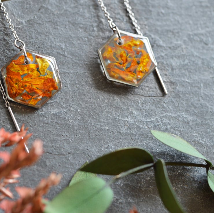 As part of the "Fleur Real Collection" are these floral Threader Earrings made with genuine natural high quality freeze dried Marigold Petals, various shades of orange and yellow cured within high gloss Resin.