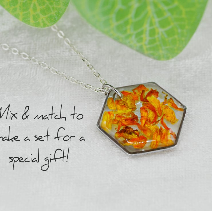 Orange Marigold Petal Hexagon Pendant https://folksy.com/items/8326662