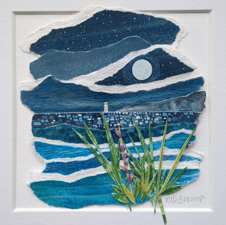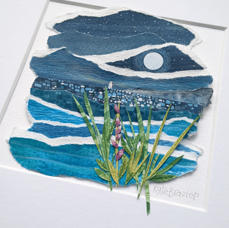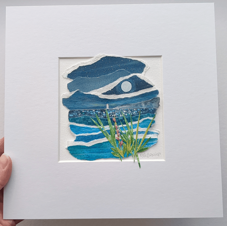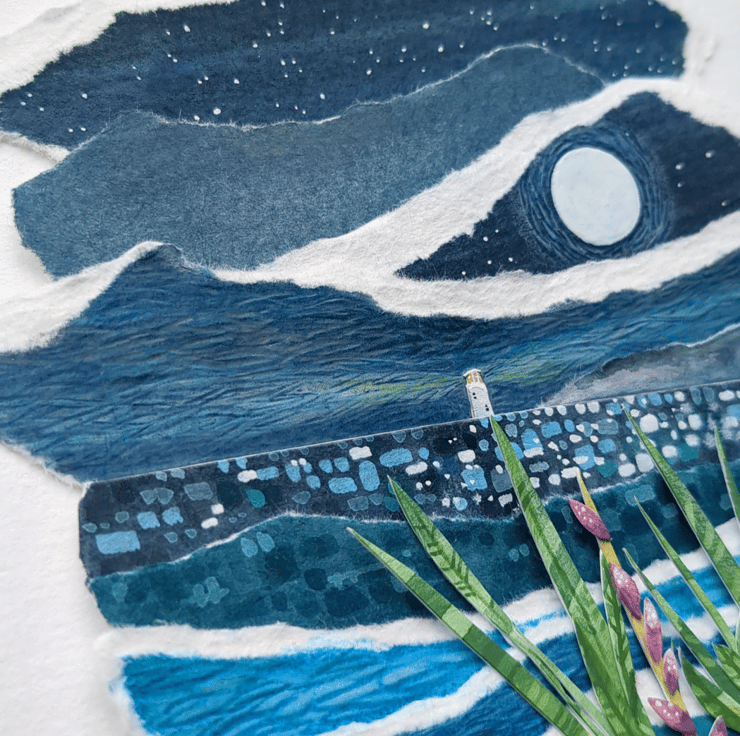 'The Blue Moon' is an original paper collage, created using a mix of mediums - including gouache paints, water soluble pencils and different weight and texture of papers.